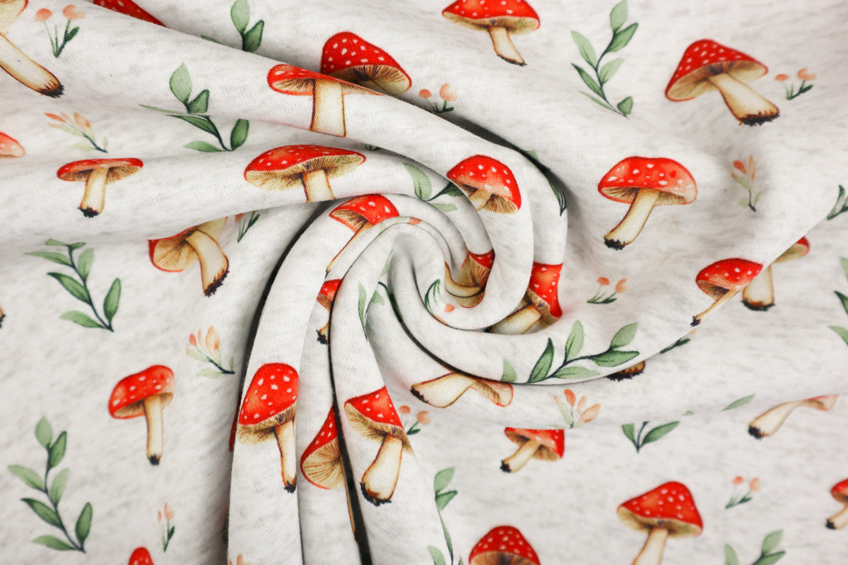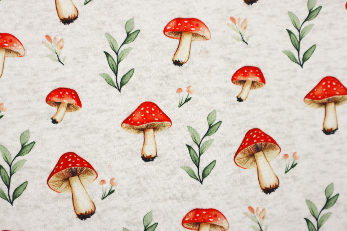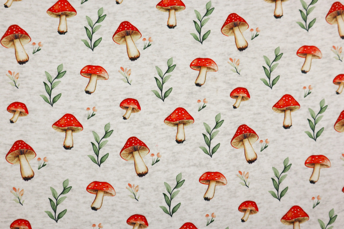 Herbstliches Muster mit kleinen Fliegenpilzen und Blättern auf meliertem Hintergrund.