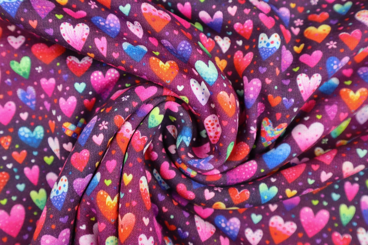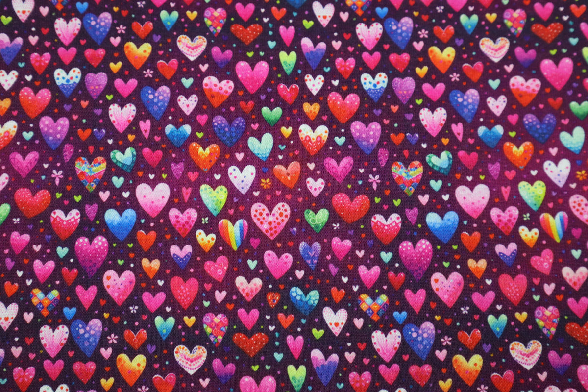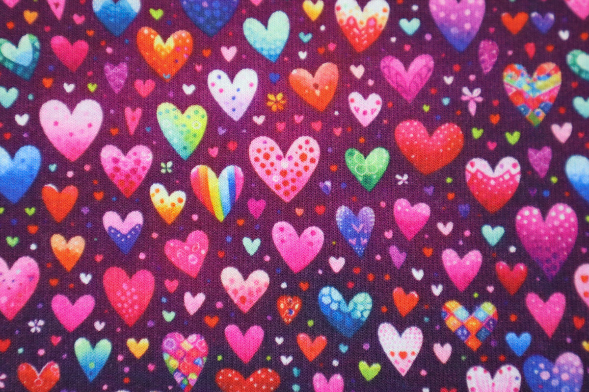 Schönes Muster mit bunten, unterschiedlich gemusterten Herzen auf beerefarbenem Hintergrund.