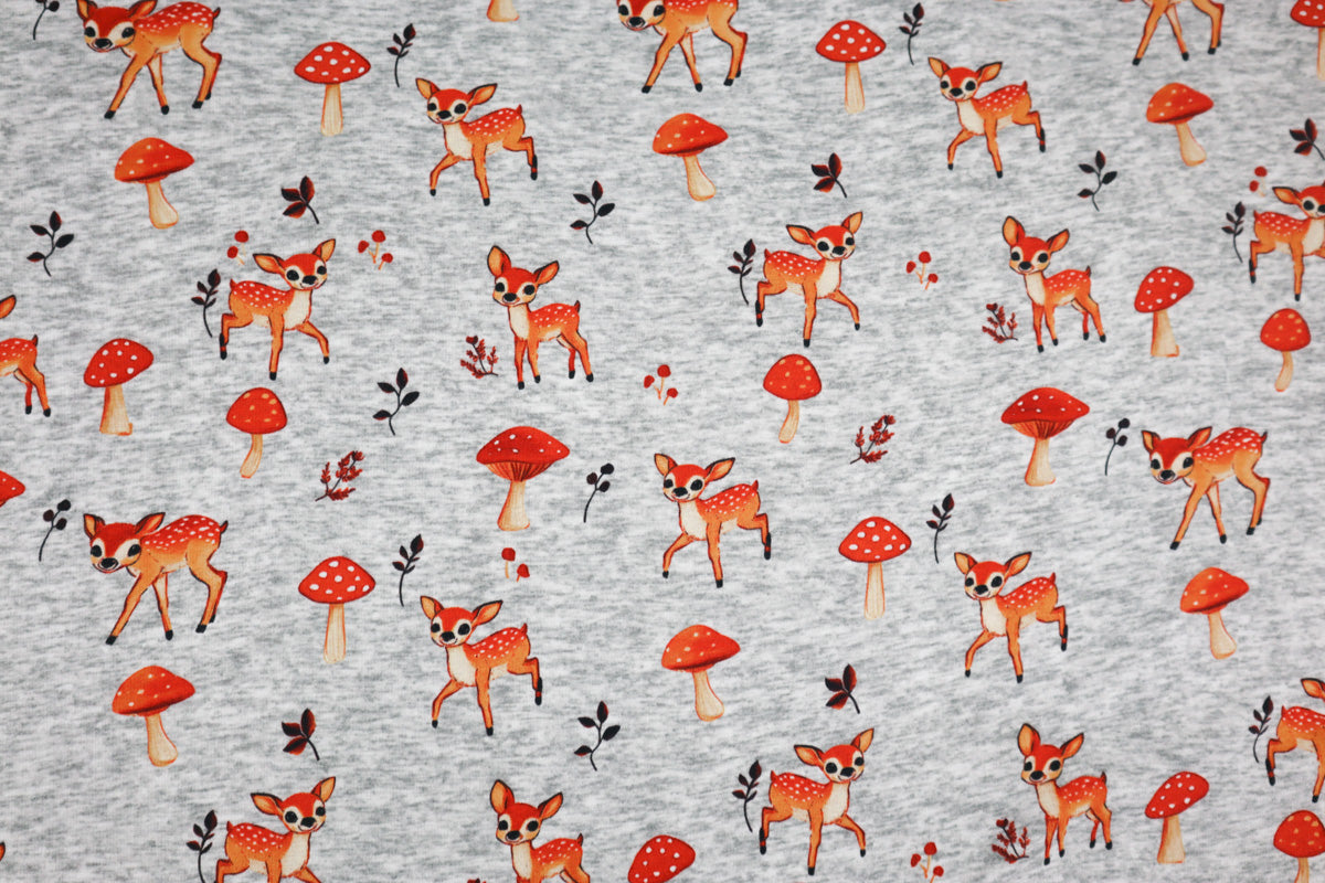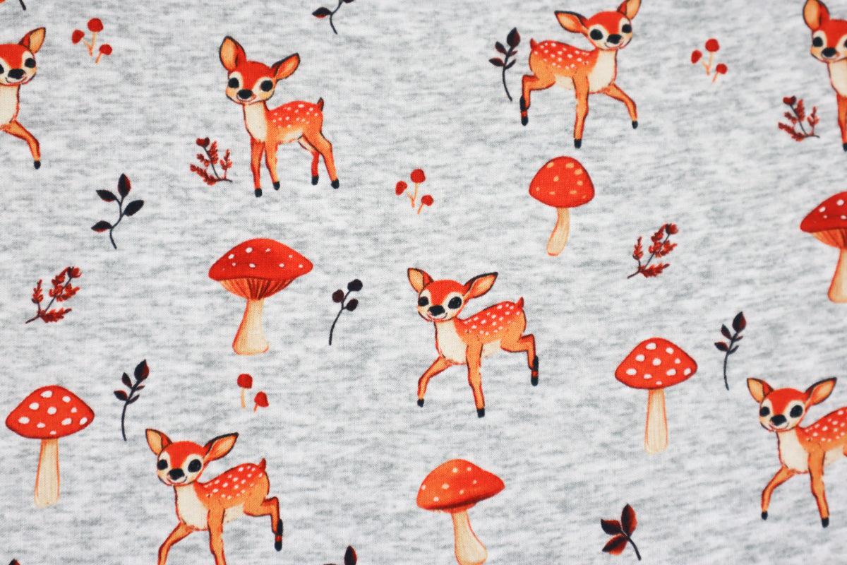 Herbstliches Muster mit kleinen Fliegenpilzen, Blättern und Rehkitzen auf meliertem Hintergrund.