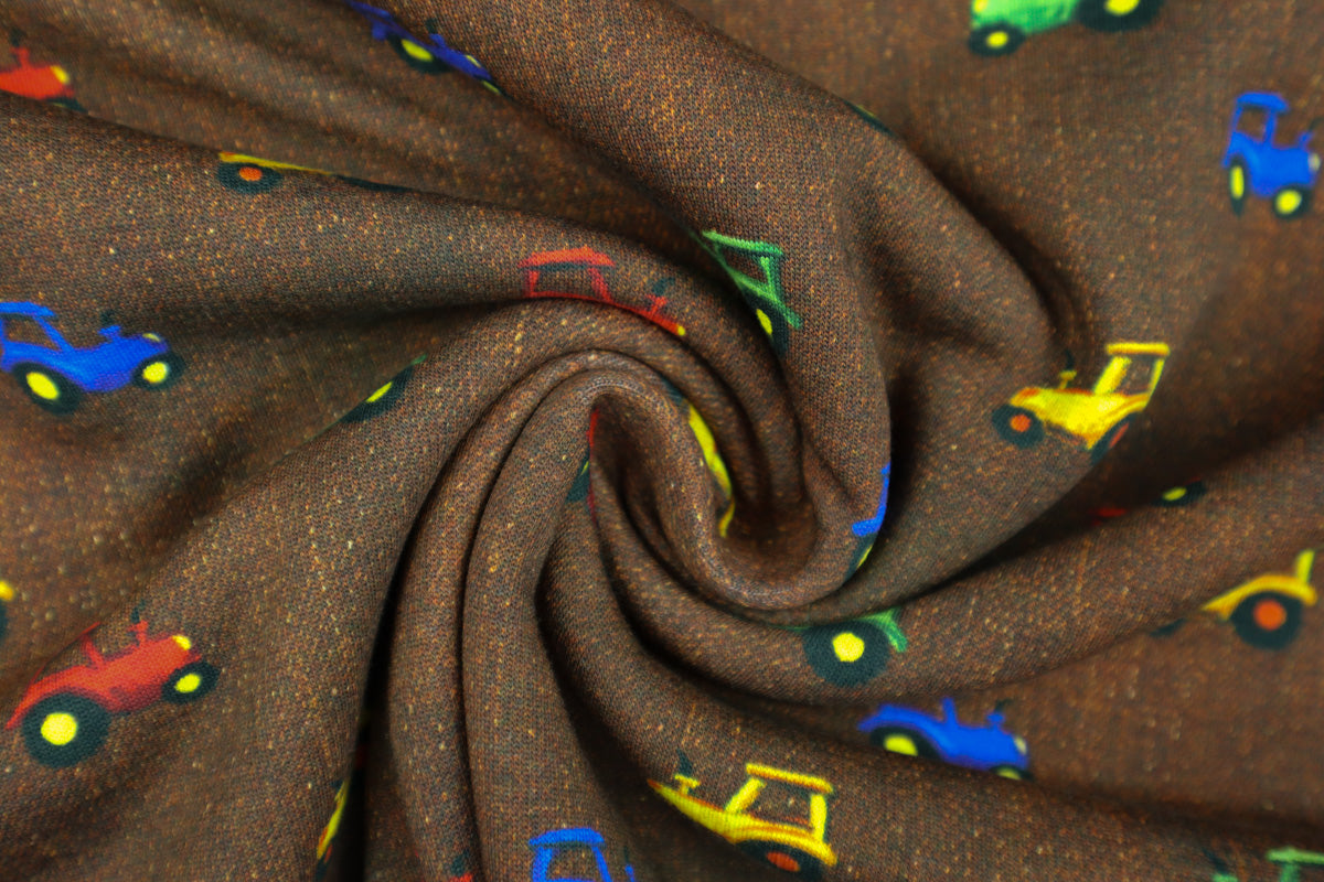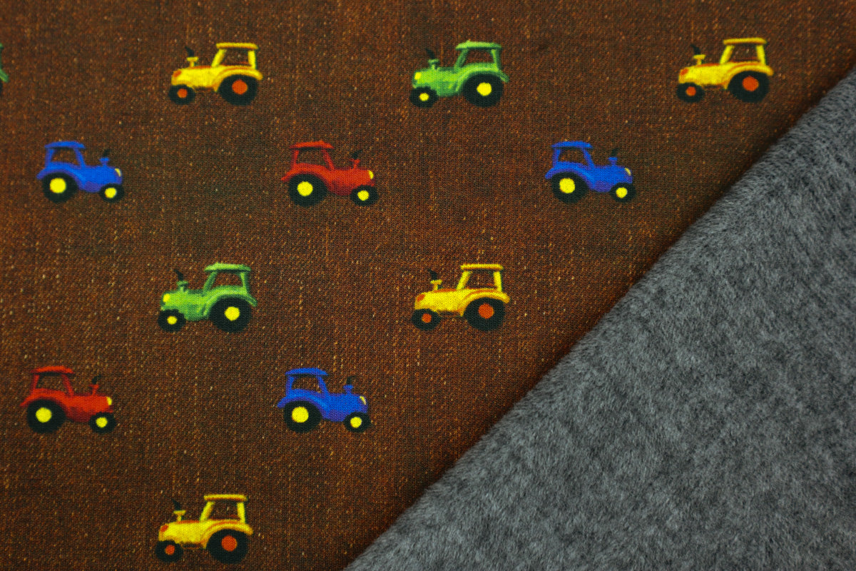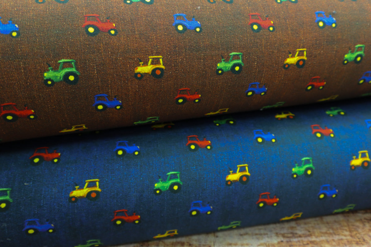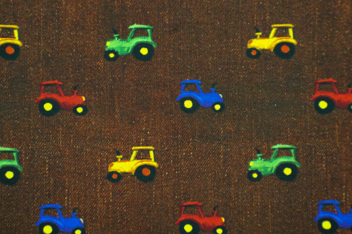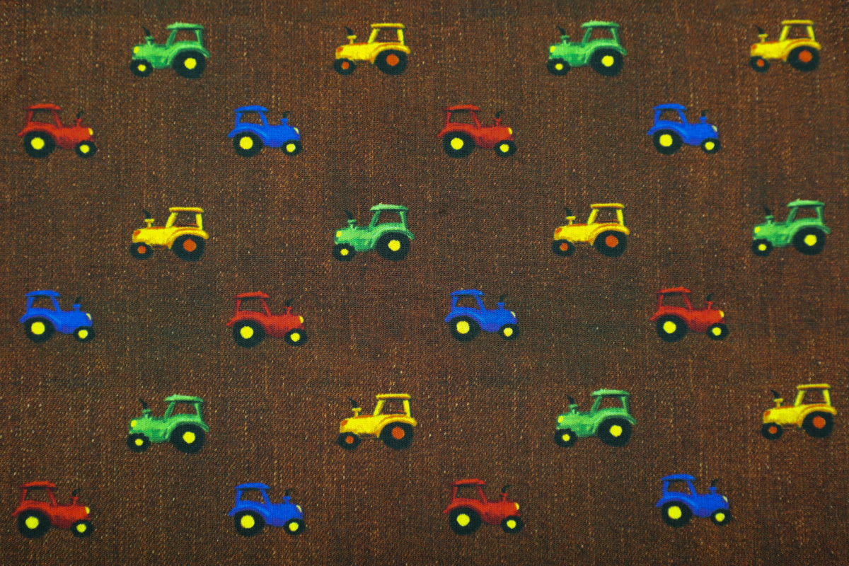 Tolles Muster mit Treckern in verschiedenen Farben auf Denim Hintergrund in Jeans-Optik.