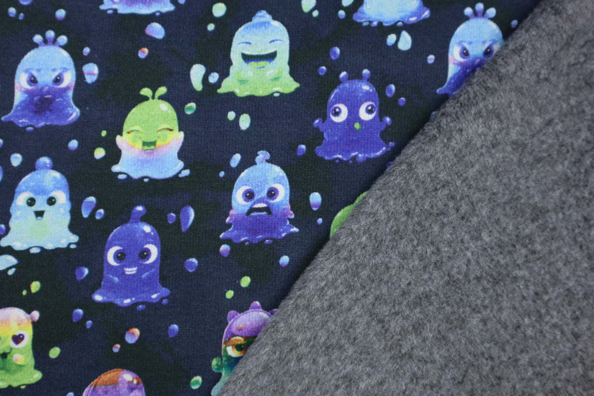 Die Vorderseite des Stoff ist Sweat, die Rückseite ist weicher, kurzer Fleece in Felloptik. Durch den Elasthan Anteil ist er angenehm elastisch und eignet sich super für Hoodies, Kleider, Hosen, Mützen, Loops und vieles mehr.
