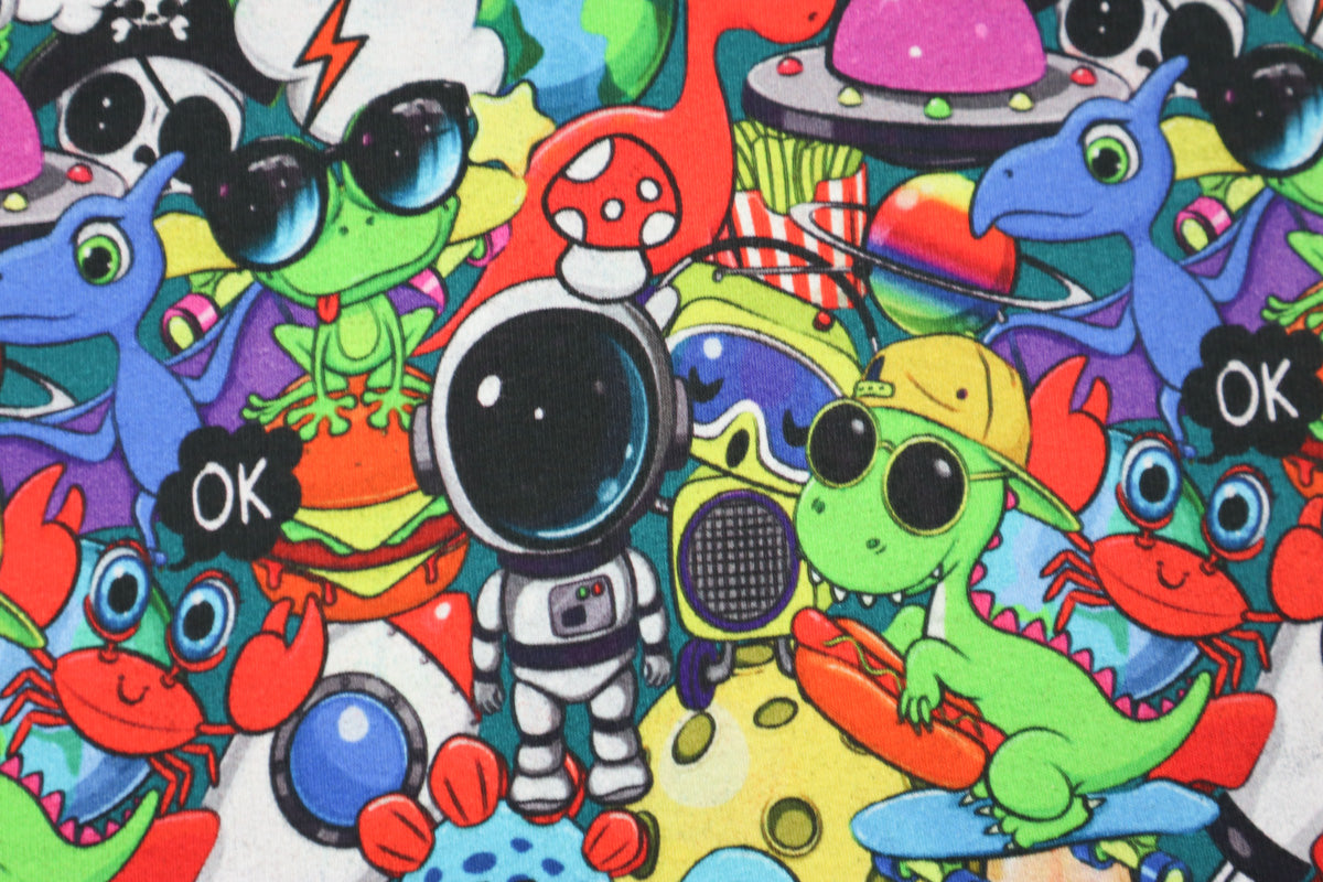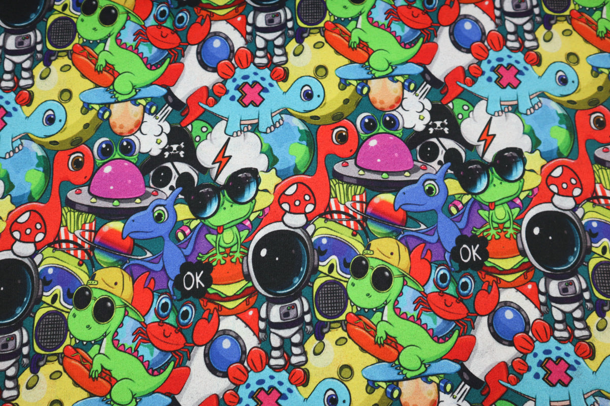 Cooles, buntes Muster mit bunten Spielzeugen auf petrolfarbenem Hintergrund.
