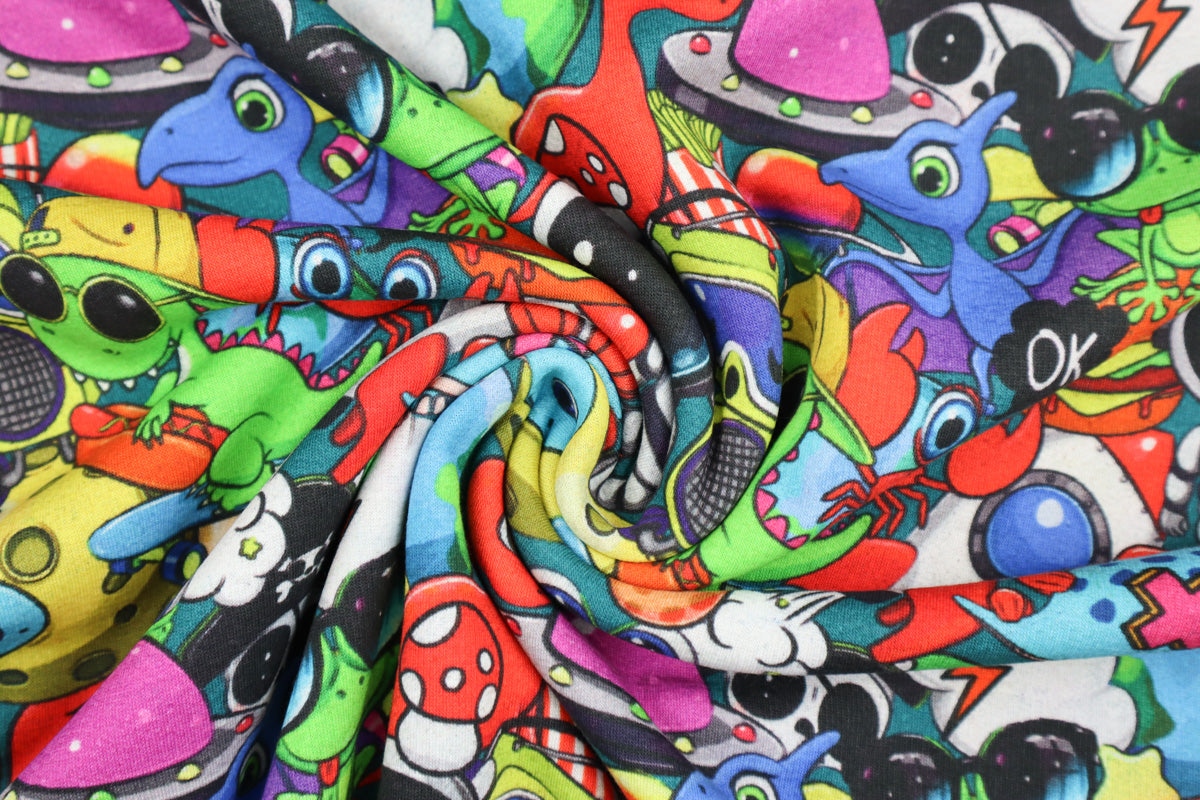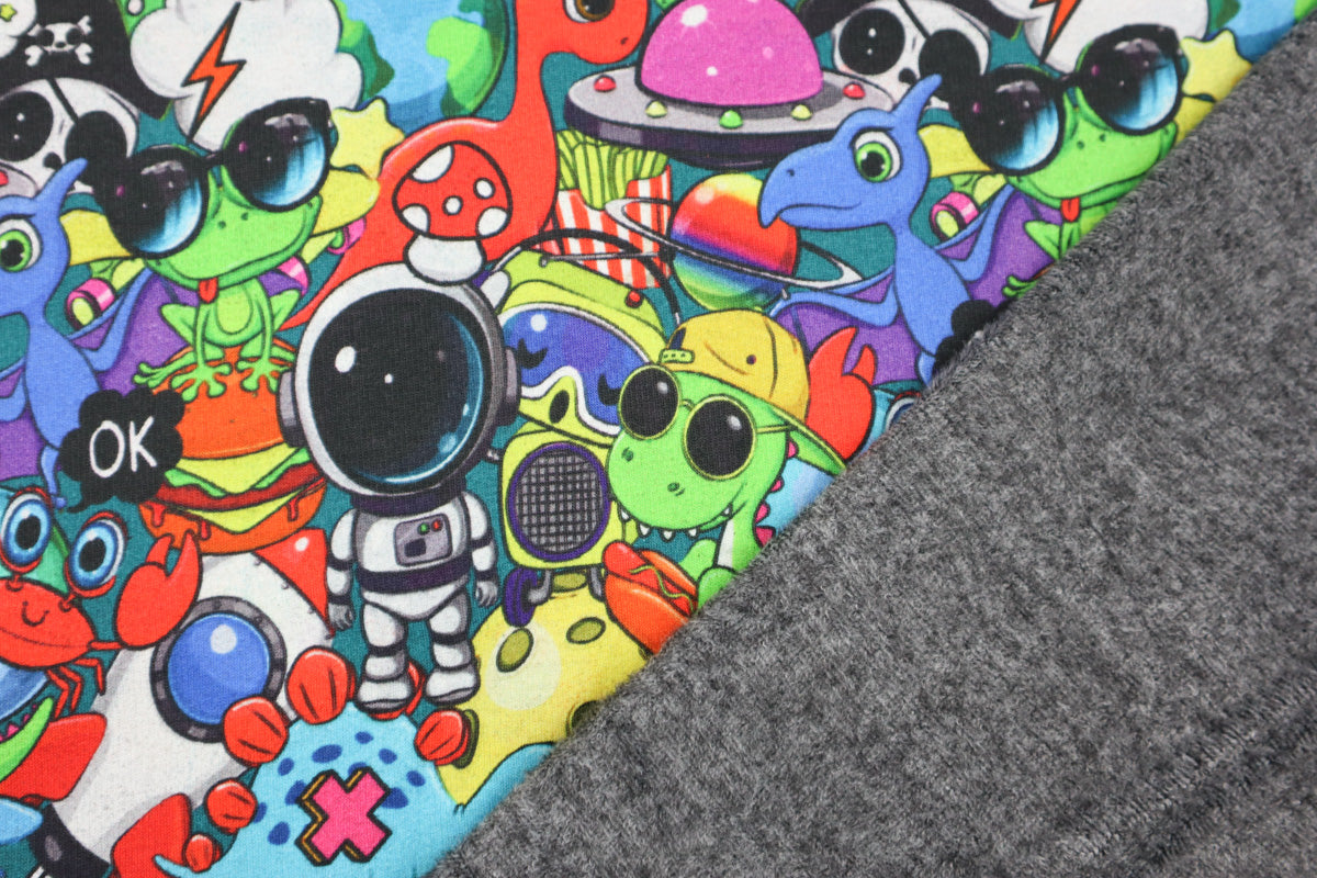Die Vorderseite des Stoff ist Sweat, die Rückseite ist weicher, kurzer Fleece in Felloptik. Durch den Elasthan Anteil ist er angenehm elastisch und eignet sich super für Hoodies, Kleider, Hosen, Mützen, Loops und vieles mehr.
