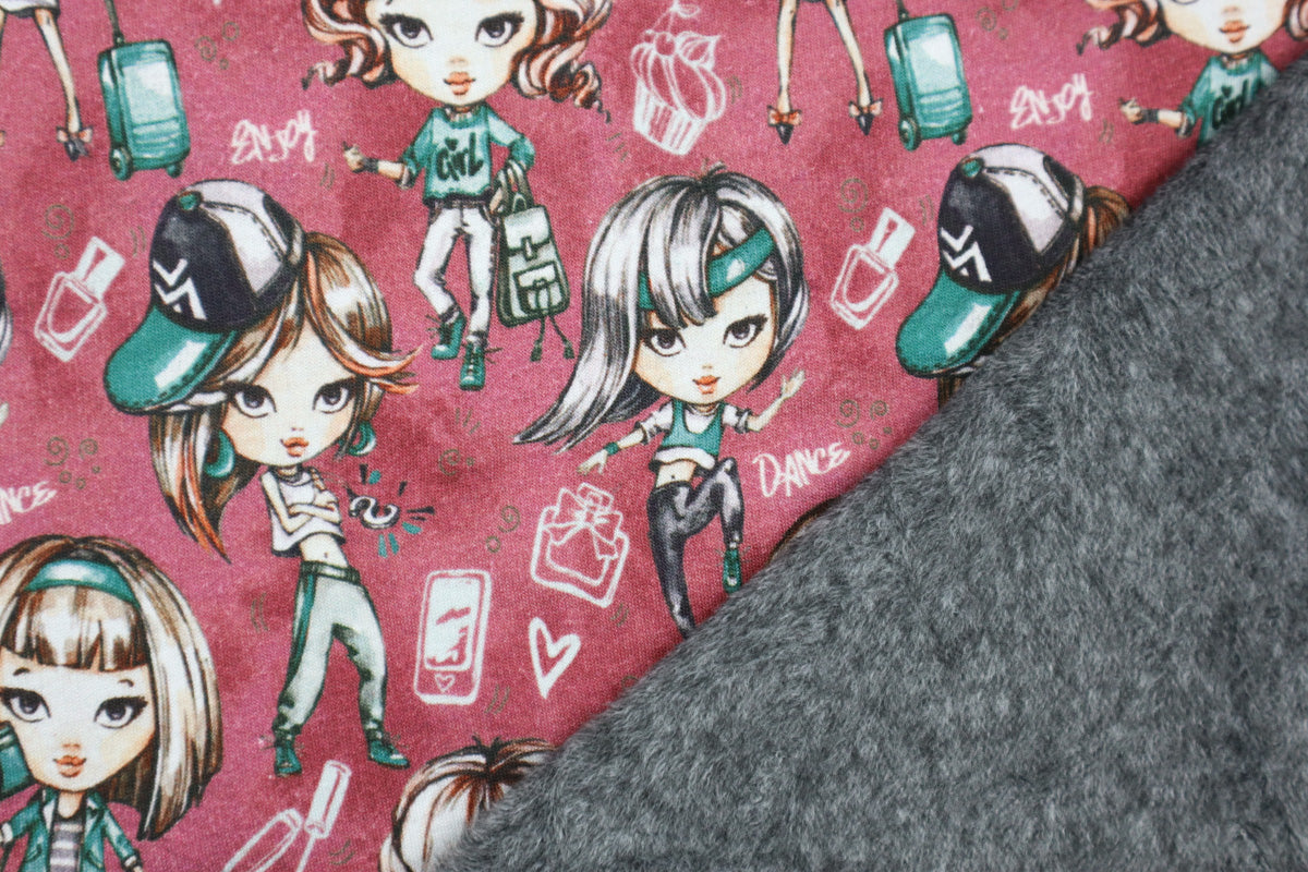 Die Vorderseite des Stoff ist Sweat, die Rückseite ist weicher, kurzer Fleece in Felloptik. Durch den Elasthan Anteil ist er angenehm elastisch und eignet sich super für Hoodies, Kleider, Hosen, Mützen, Loops und vieles mehr.