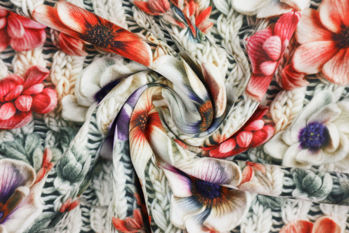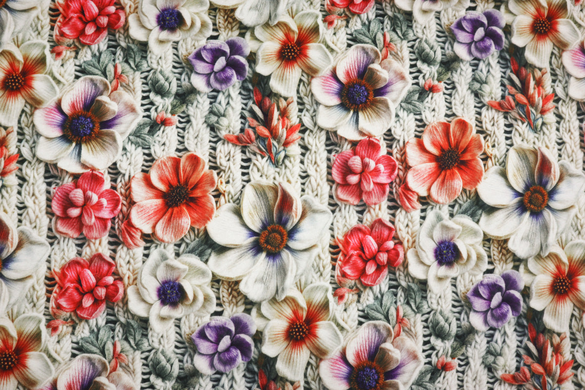 Richtig schönes 3D-Muster mit Blüten auf gestricktem Hintergrund.