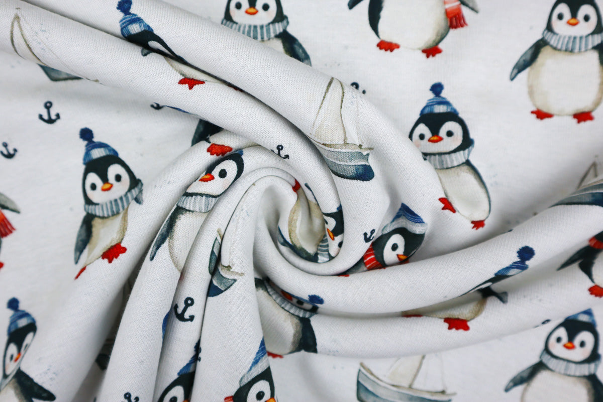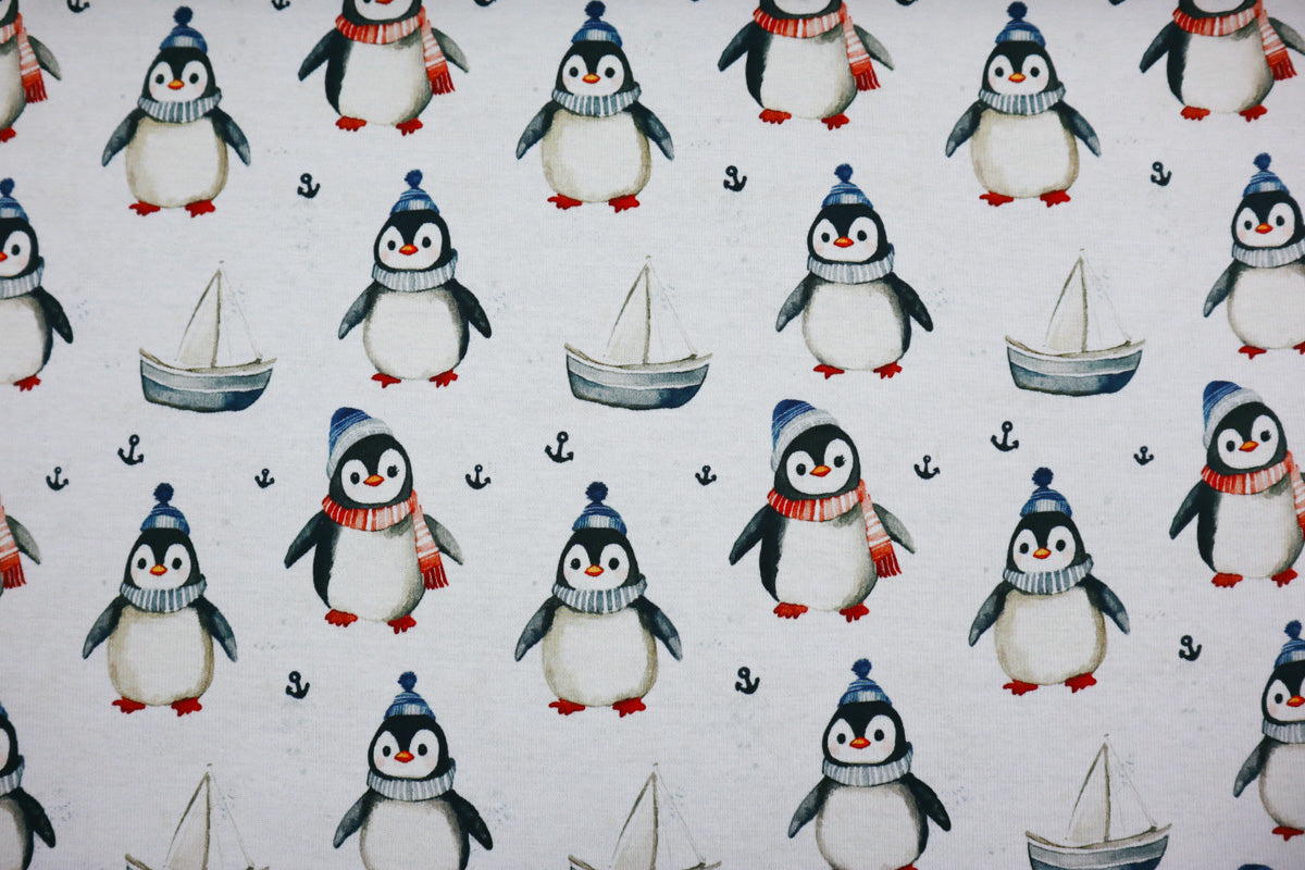 Niedliches Muster mit kleinen Pinguinen mit Pudelmütze, Ankern und Schiffen - ein schönes maritimes Muster.