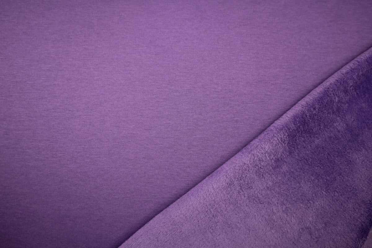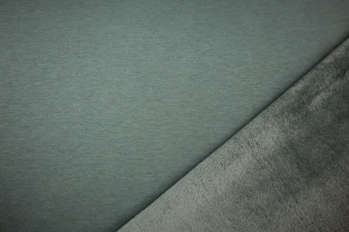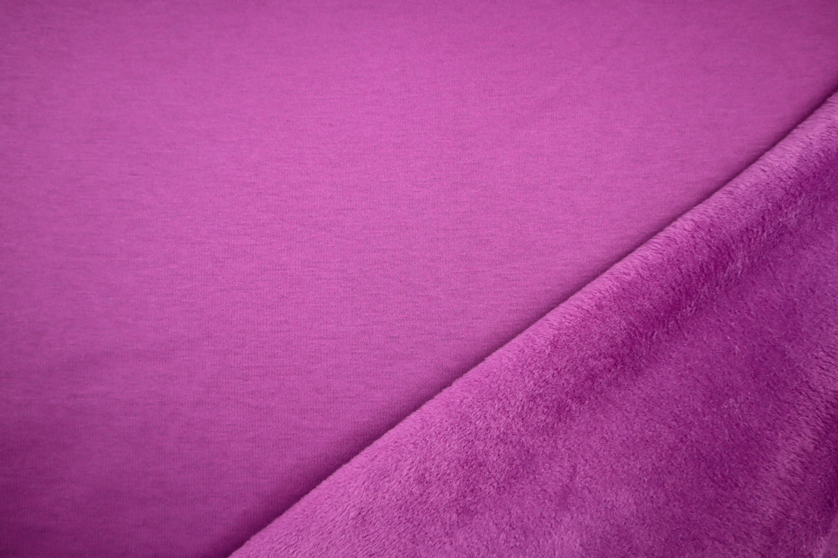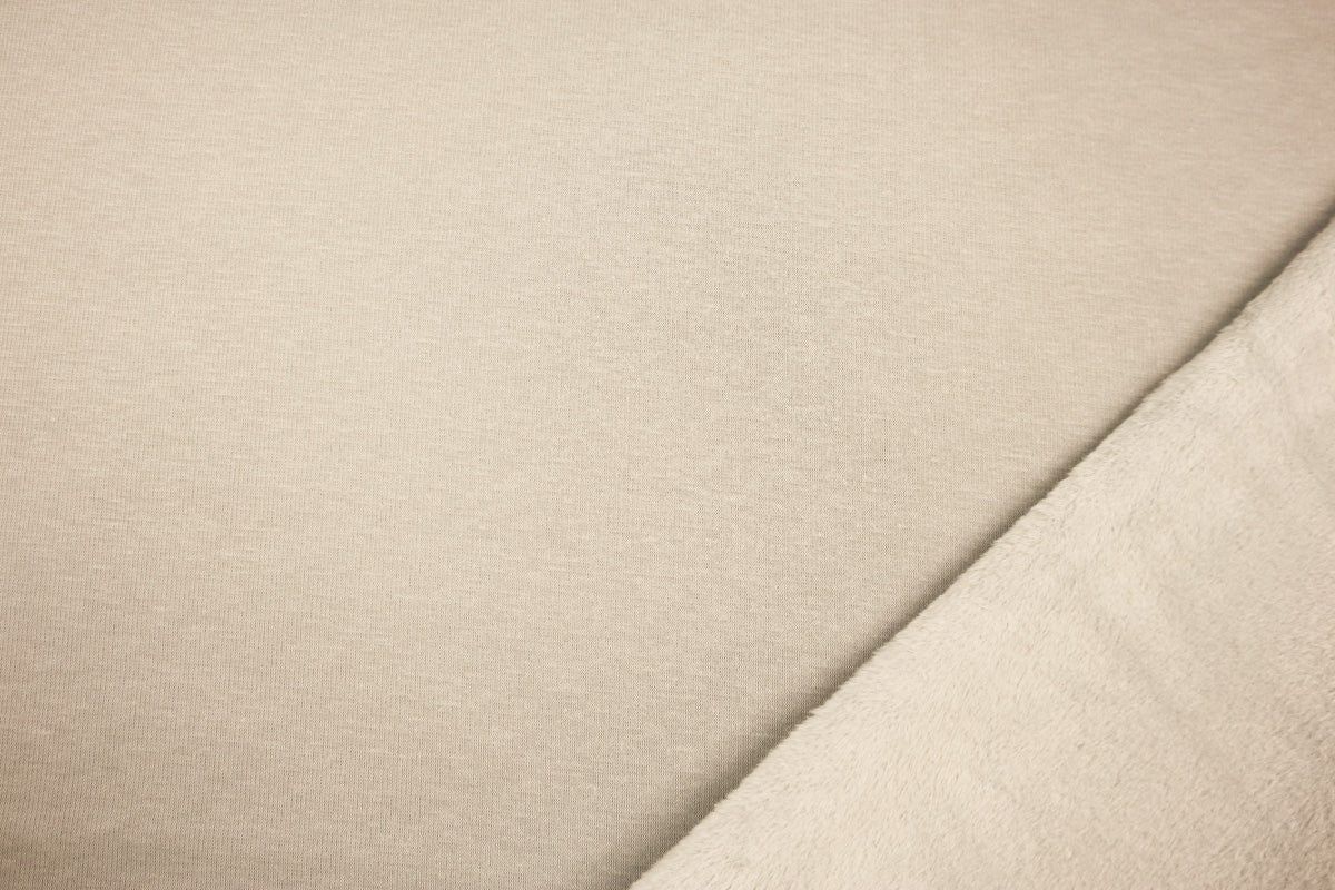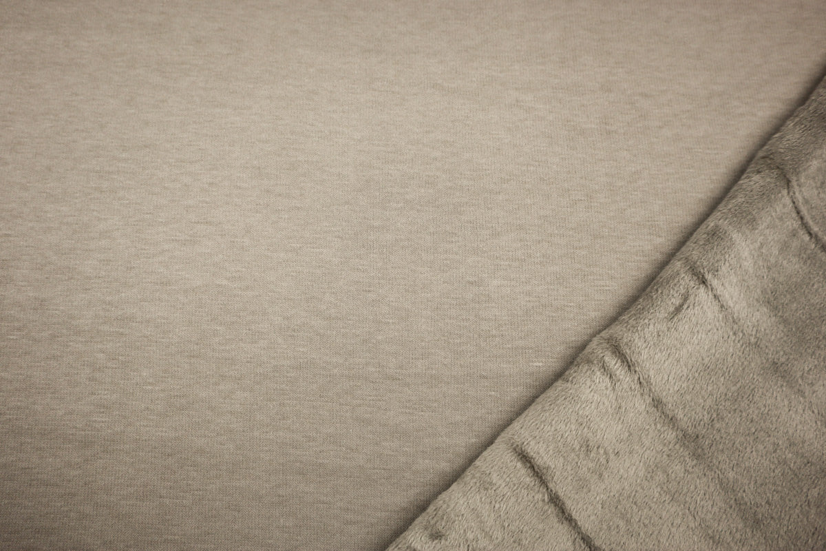 Die Vorderseite des Stoffes ist Sweat, die Rückseite ist weicher Fleece in Felloptik in gleicher Farbe.