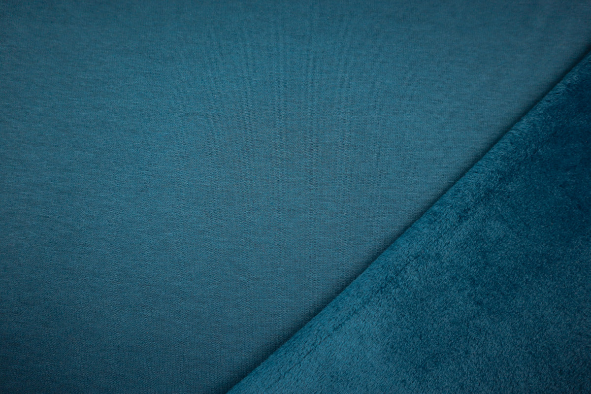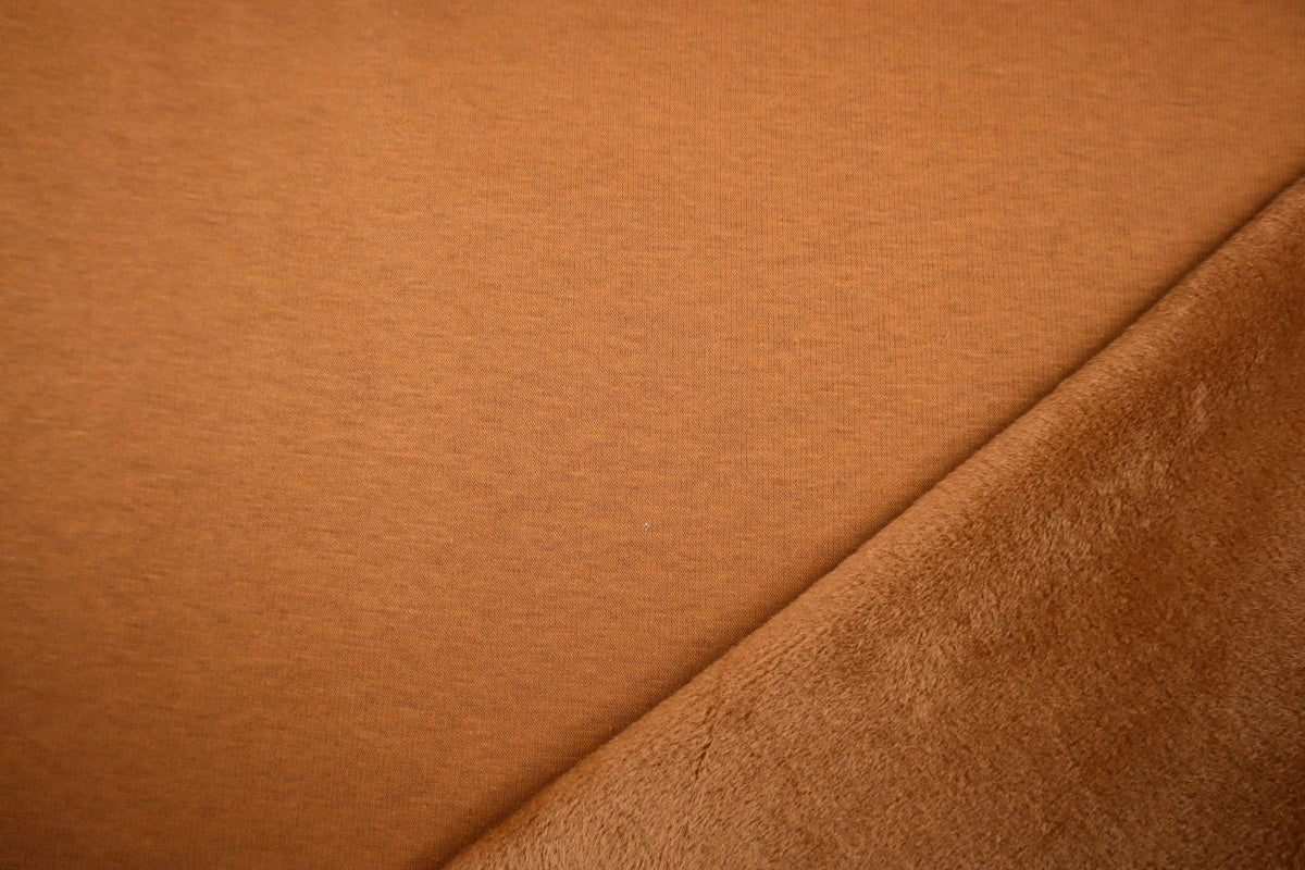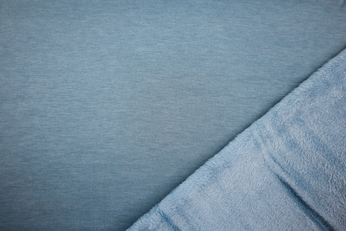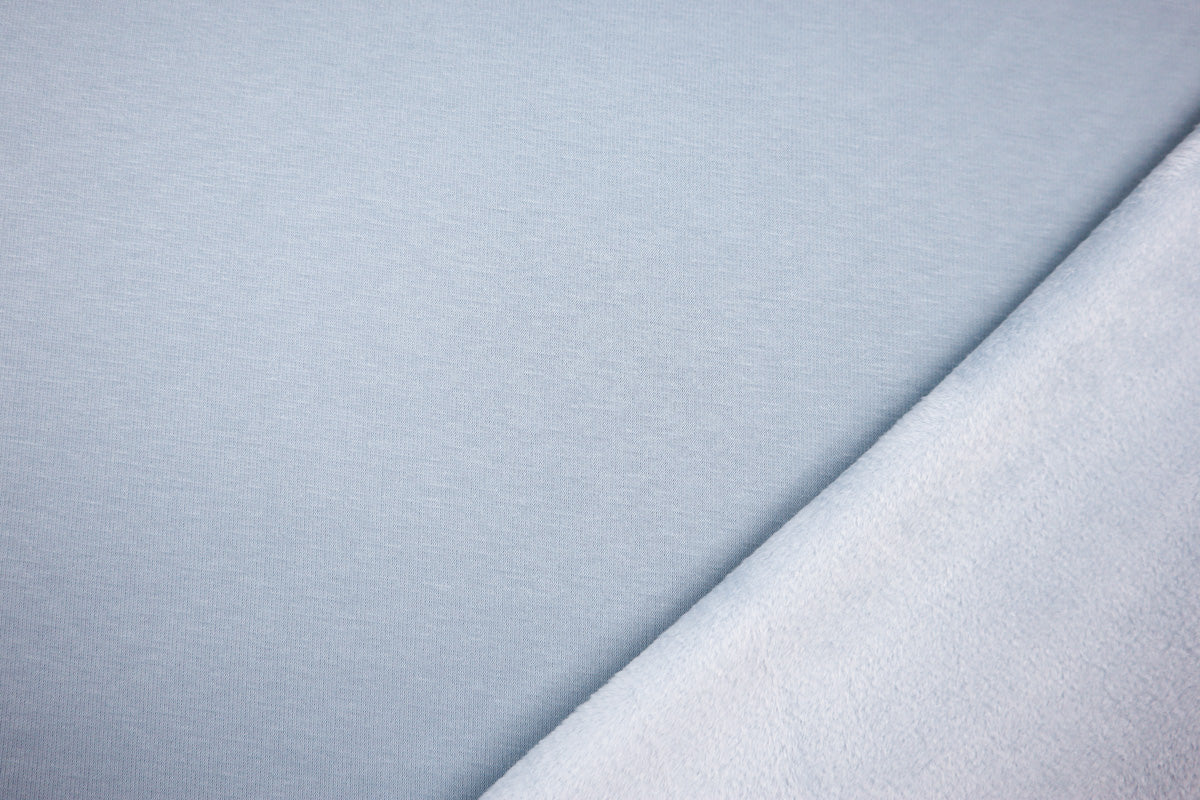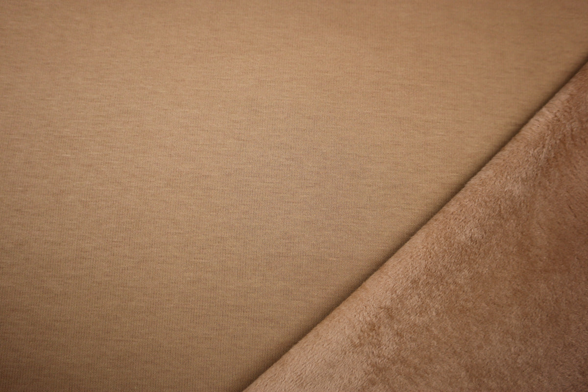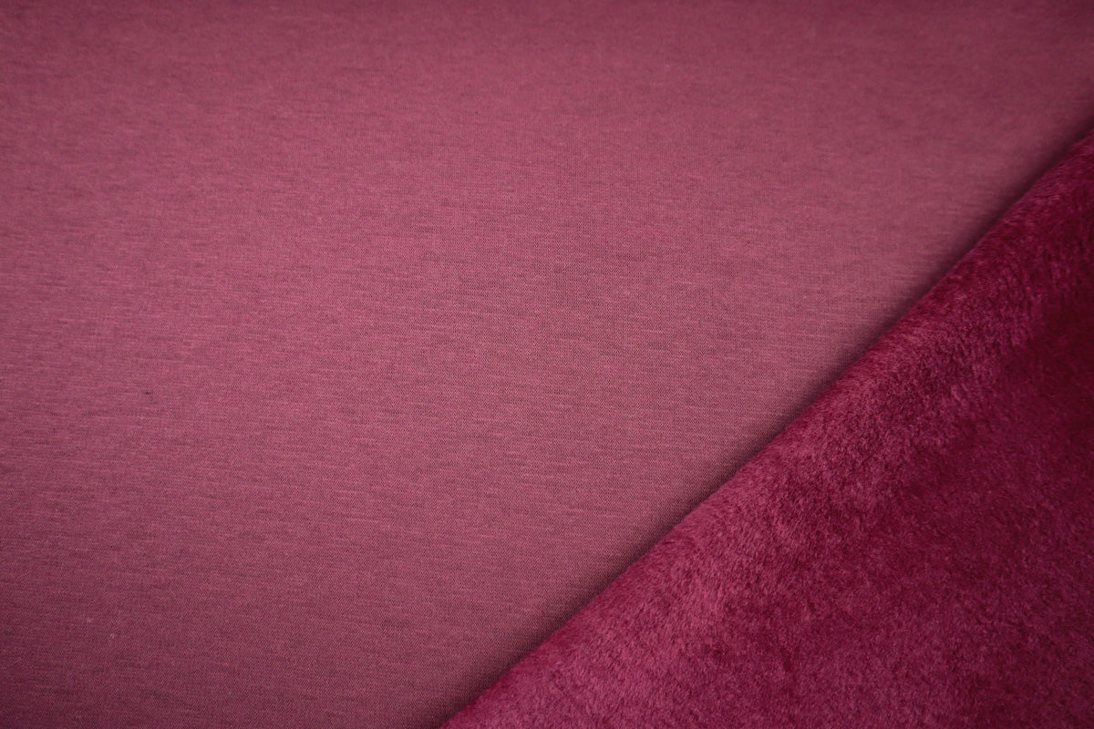 Die Vorderseite des Stoffes ist Sweat, die Rückseite ist weicher Fleece in Felloptik in gleicher Farbe.