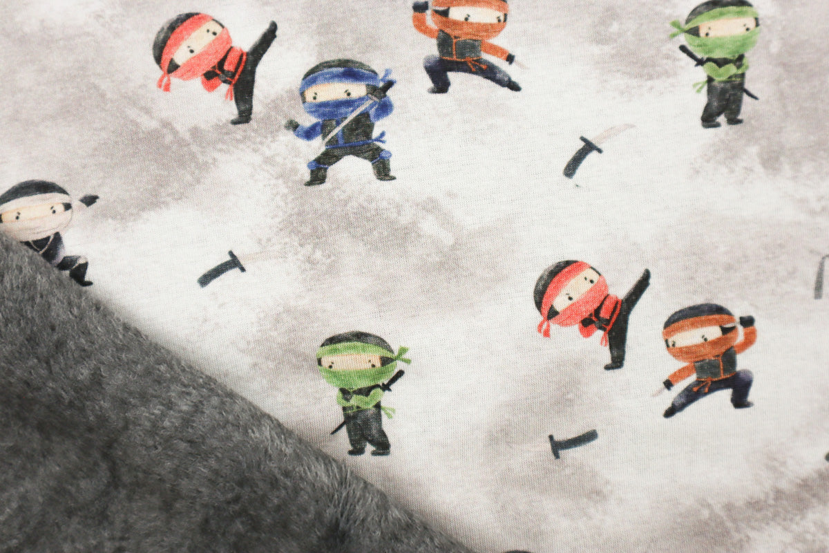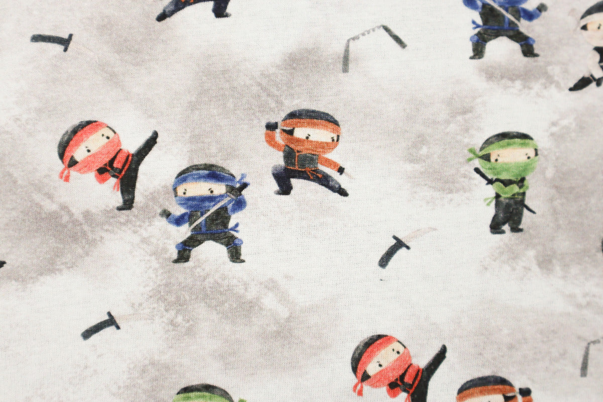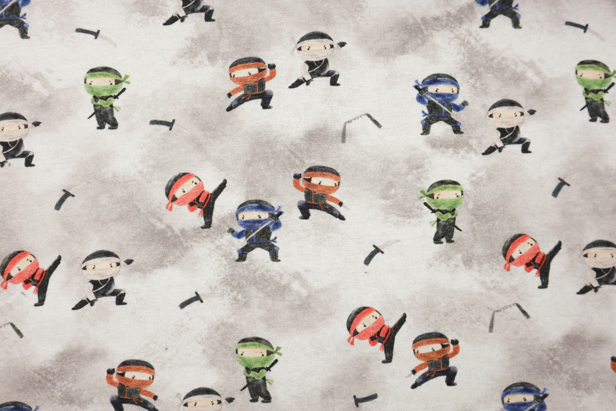 Tolles Muster mit kleinen Ninja Kämpfern auf gebatiktem Hintergrund.