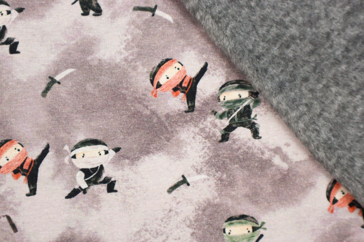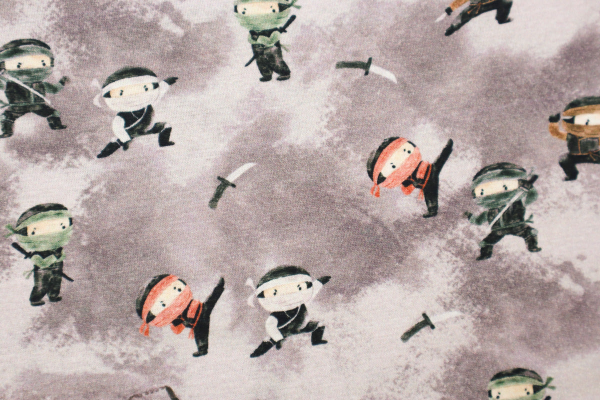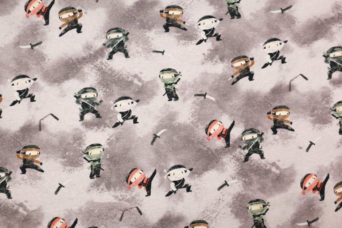 Tolles Muster mit kleinen Ninja Kämpfern auf gebatiktem Hintergrund.