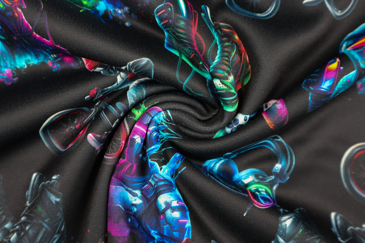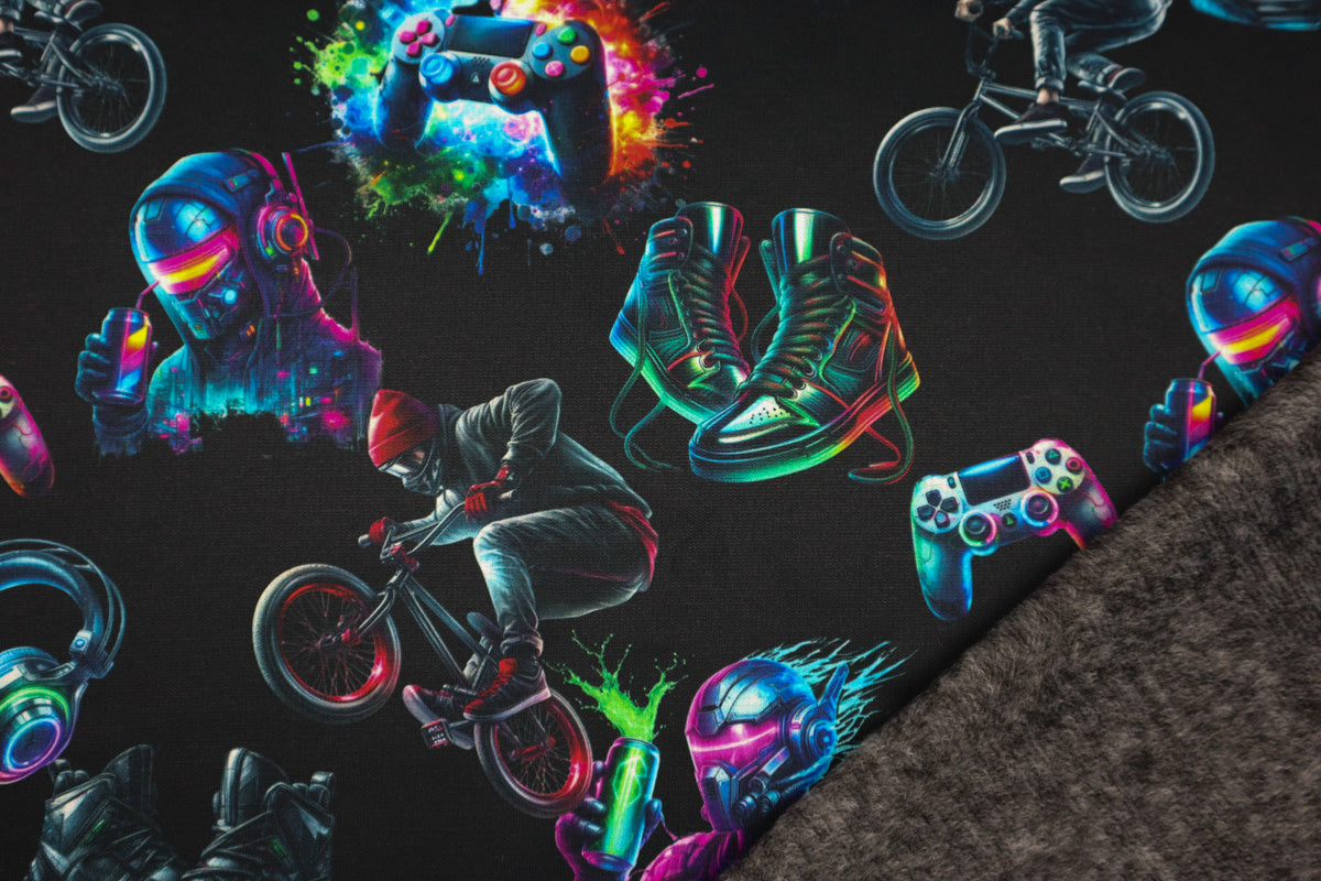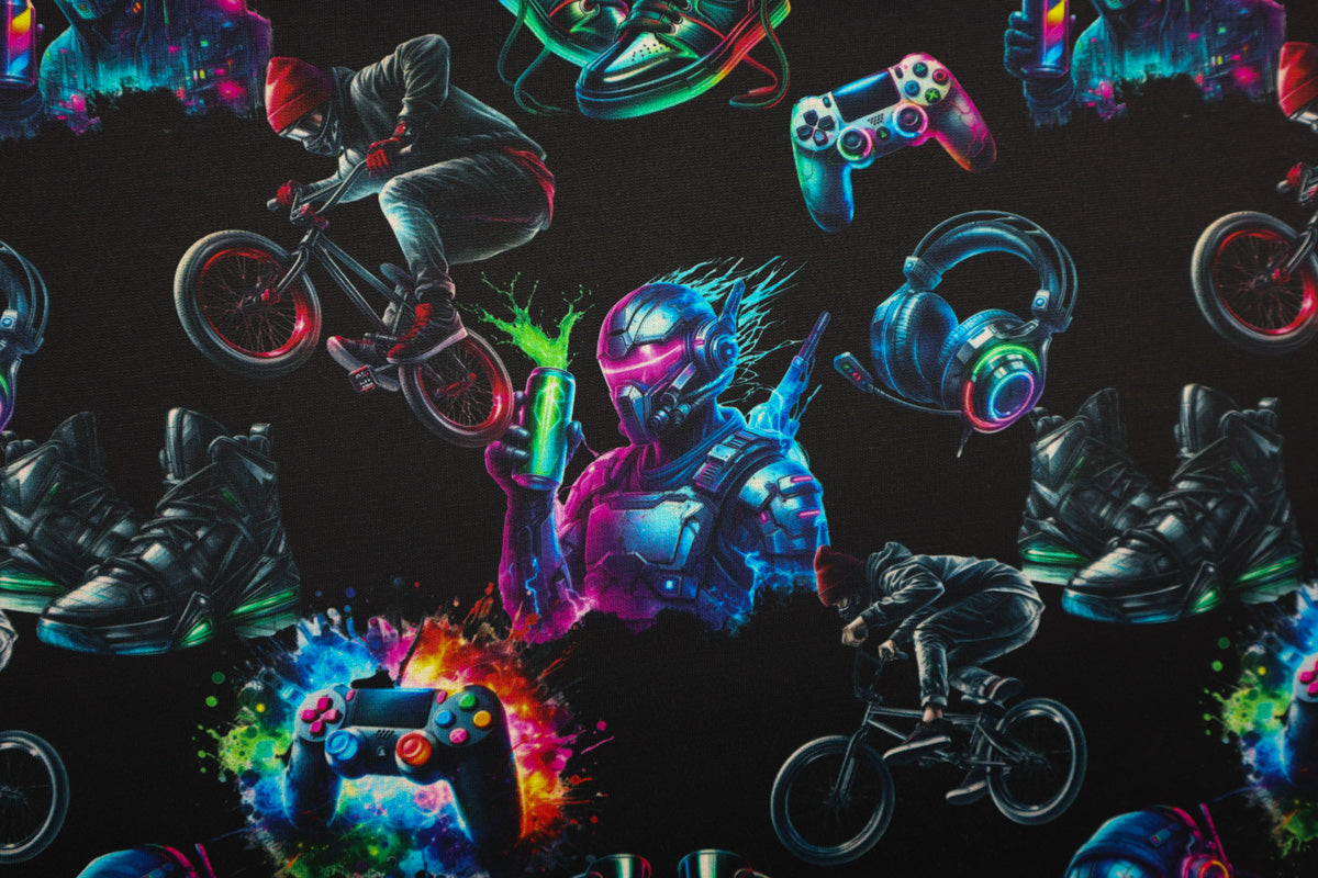 Cooles, Muster mit Skatern, Controllern uvm in bunten Farben auf schwarzem Hintergrund.