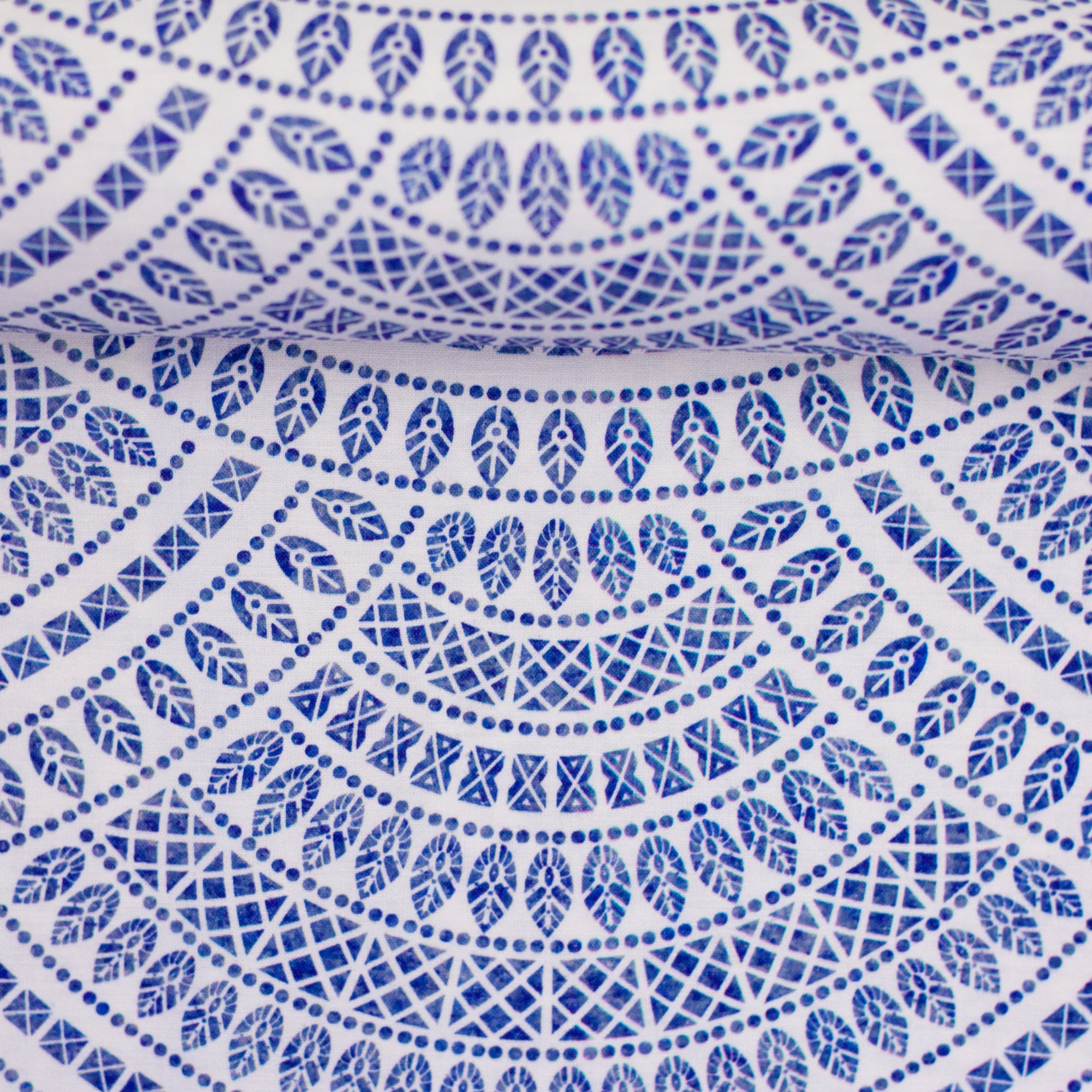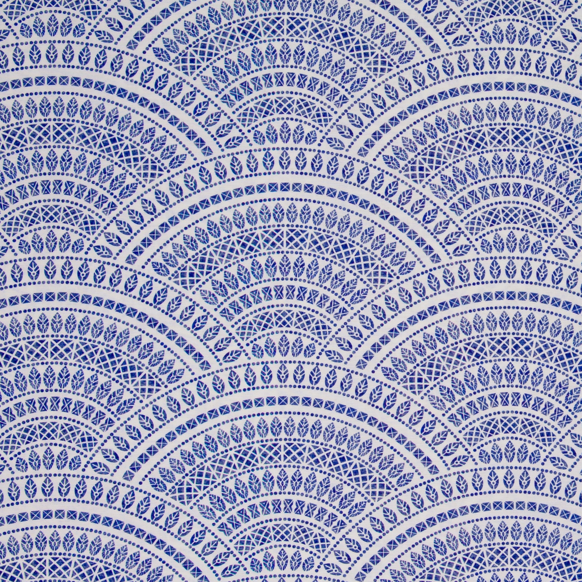 Das Muster von Mira zeigt ein dekoratives, mediterran inspiriertes Ornamentdesign mit sich wiederholenden Bögen, feinen Linien und kleinen grafischen Details. Die Anordnung wirkt rhythmisch und harmonisch, dabei klar strukturiert und nicht verspielt. In klassischem Blau-Weiß gehalten, strahlt der Stoff Frische, Ruhe und zeitlose Eleganz aus, mit einer Anmutung, die an Keramik, Mosaike oder südliche Architektur erinnert.
