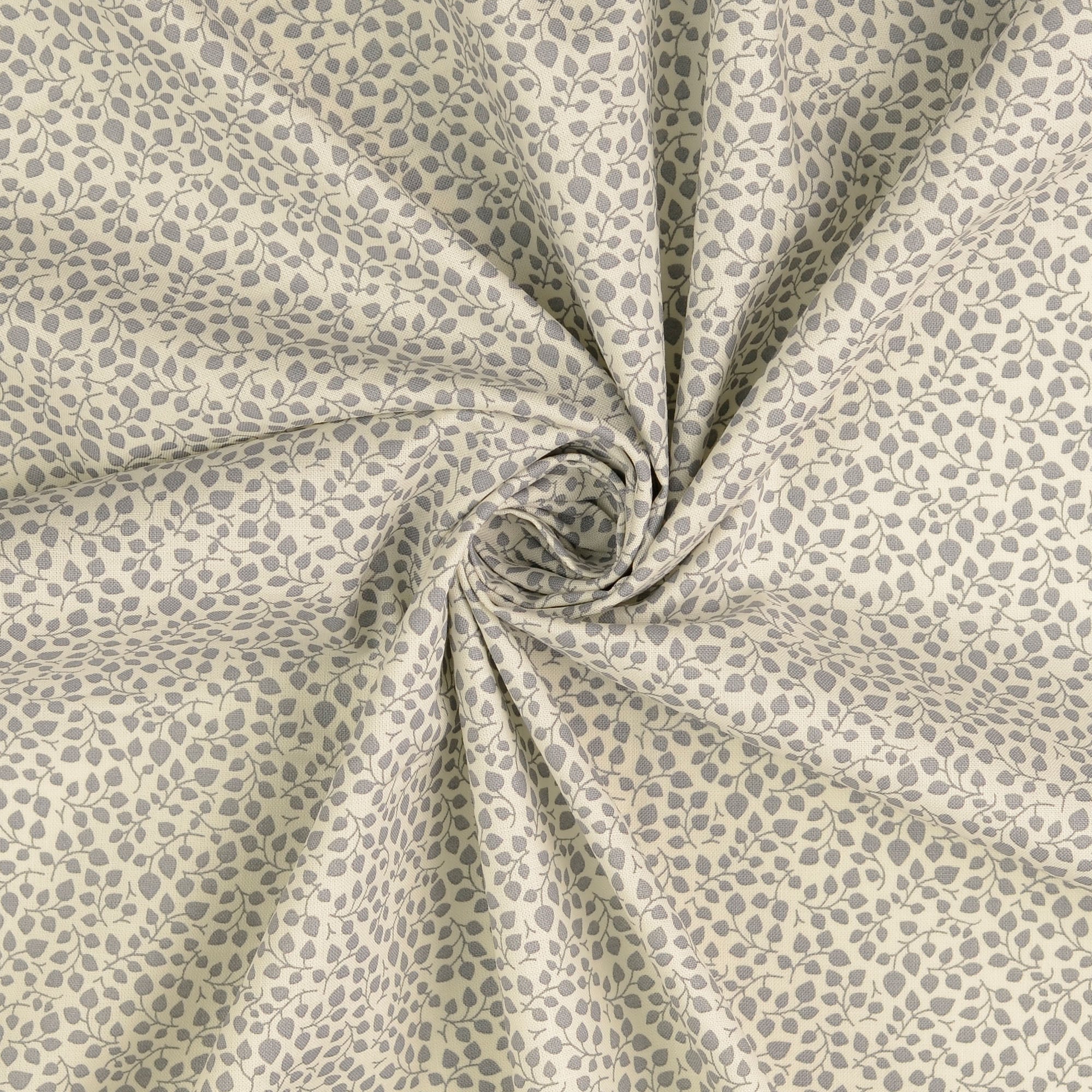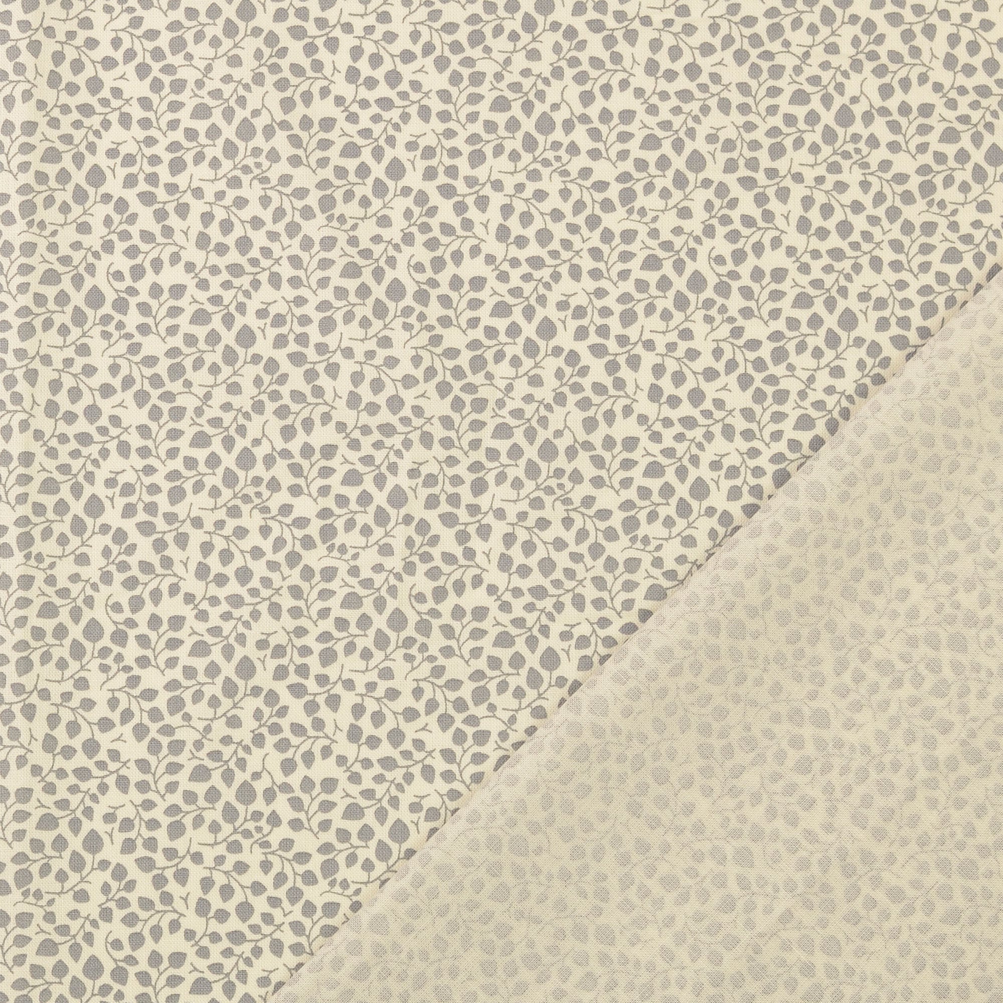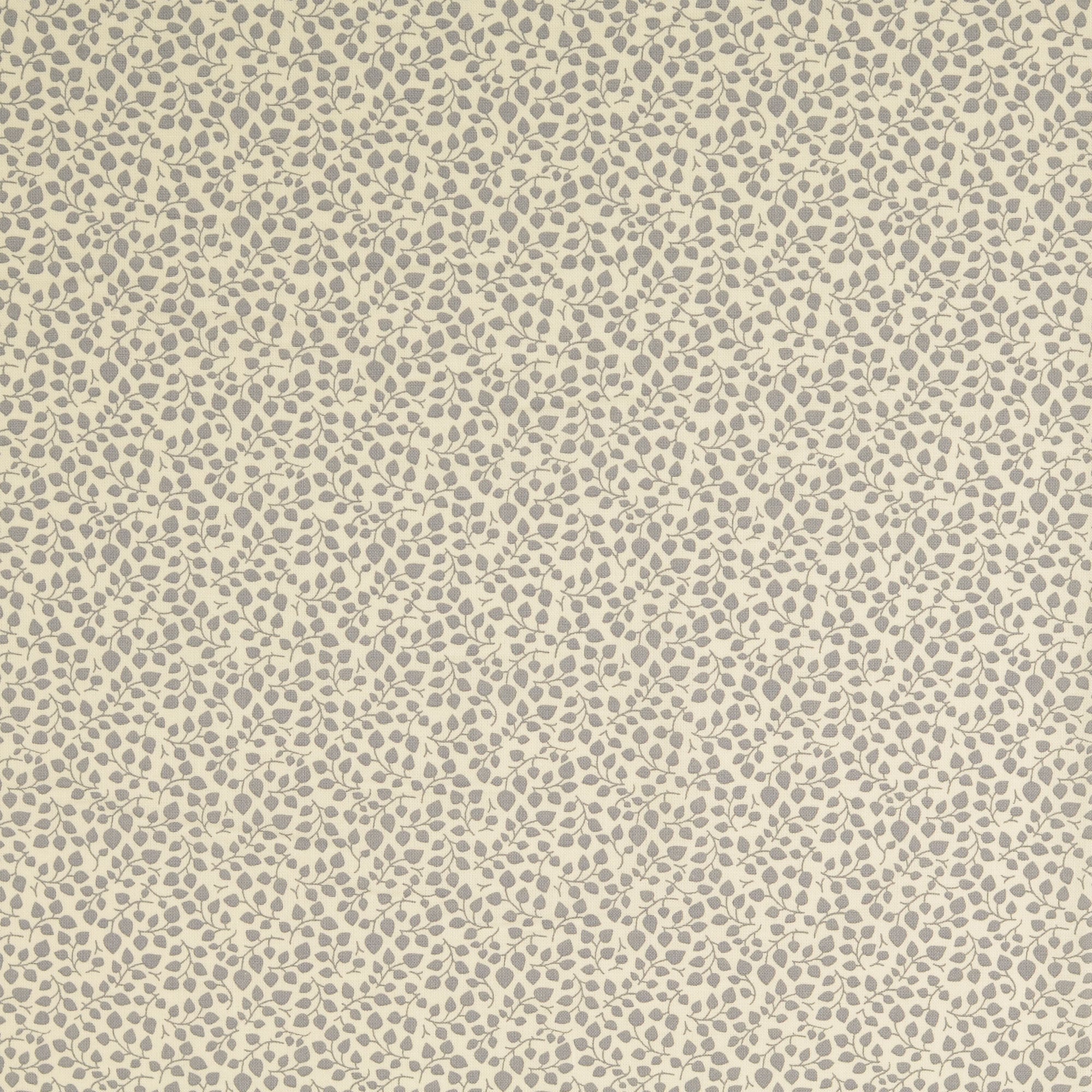 Schönes Muster mit kleinen, grauen Blätterranken auf naturfarbenem Hintergrund.