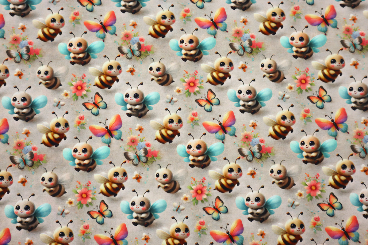 Niedliches Muster mit kleinen Bienen und bunten Schmetterlingen.