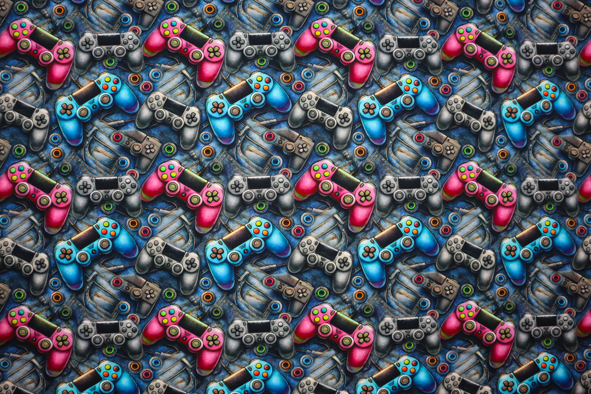 Cooles Muster mit Controllern auf Jeanshosen-Hintergrund.
