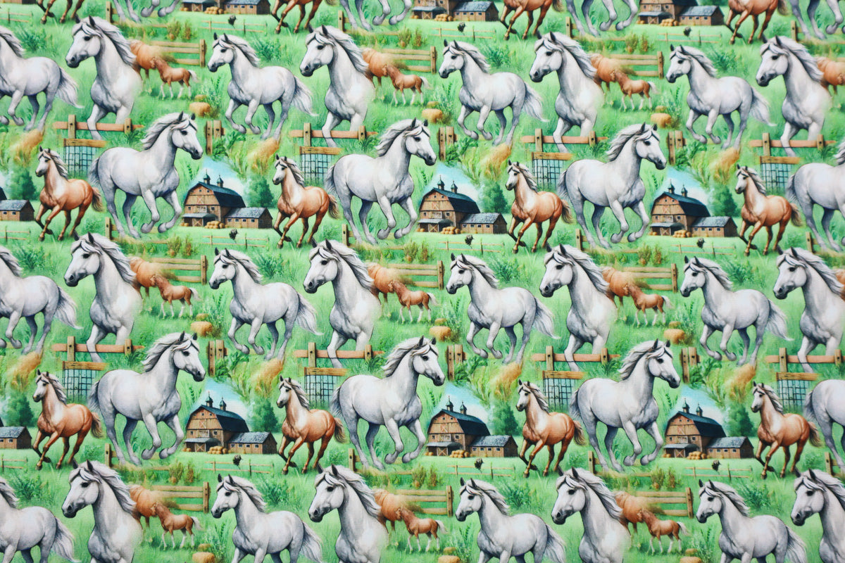 Schönes Muster mit galoppierenden Pferden und kleinen Bauernhäusern auf grüner Wiese.