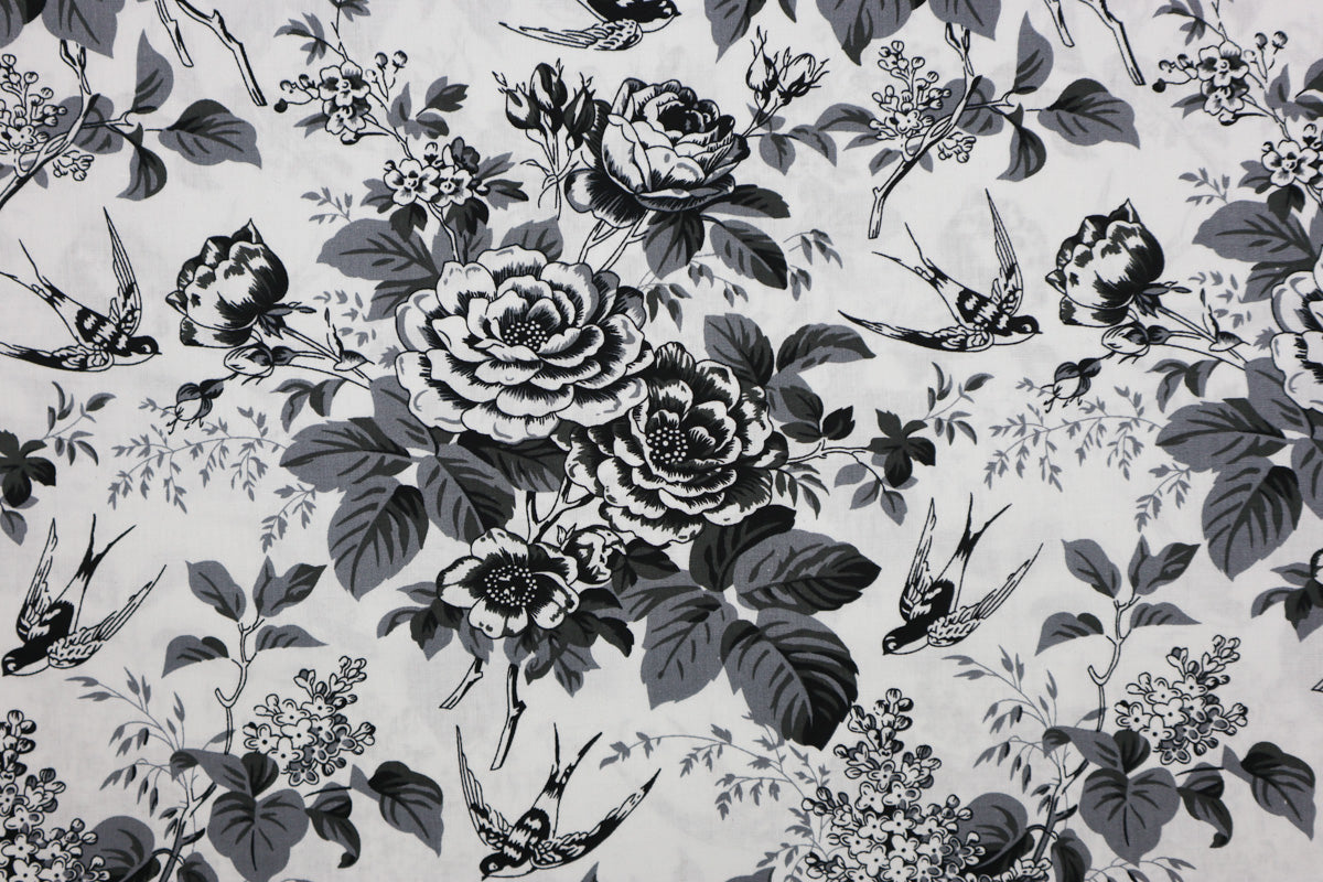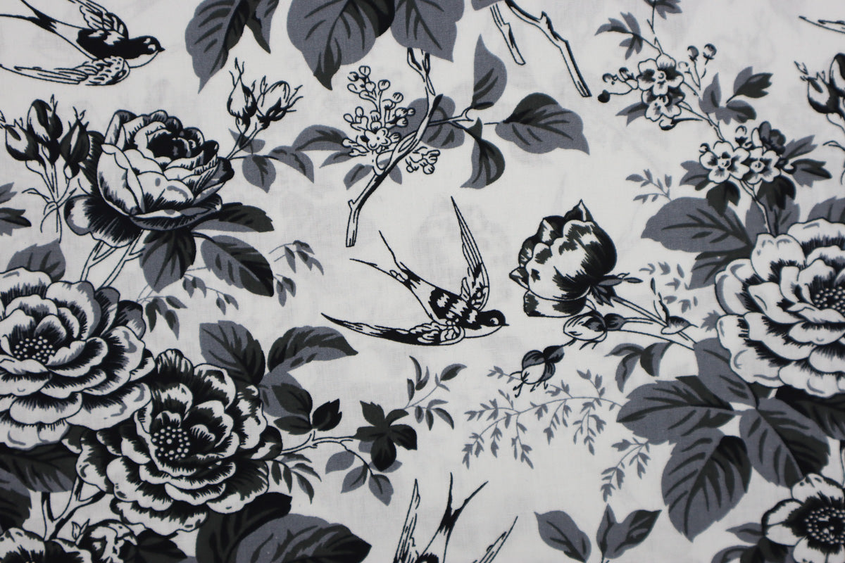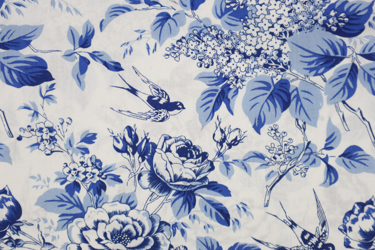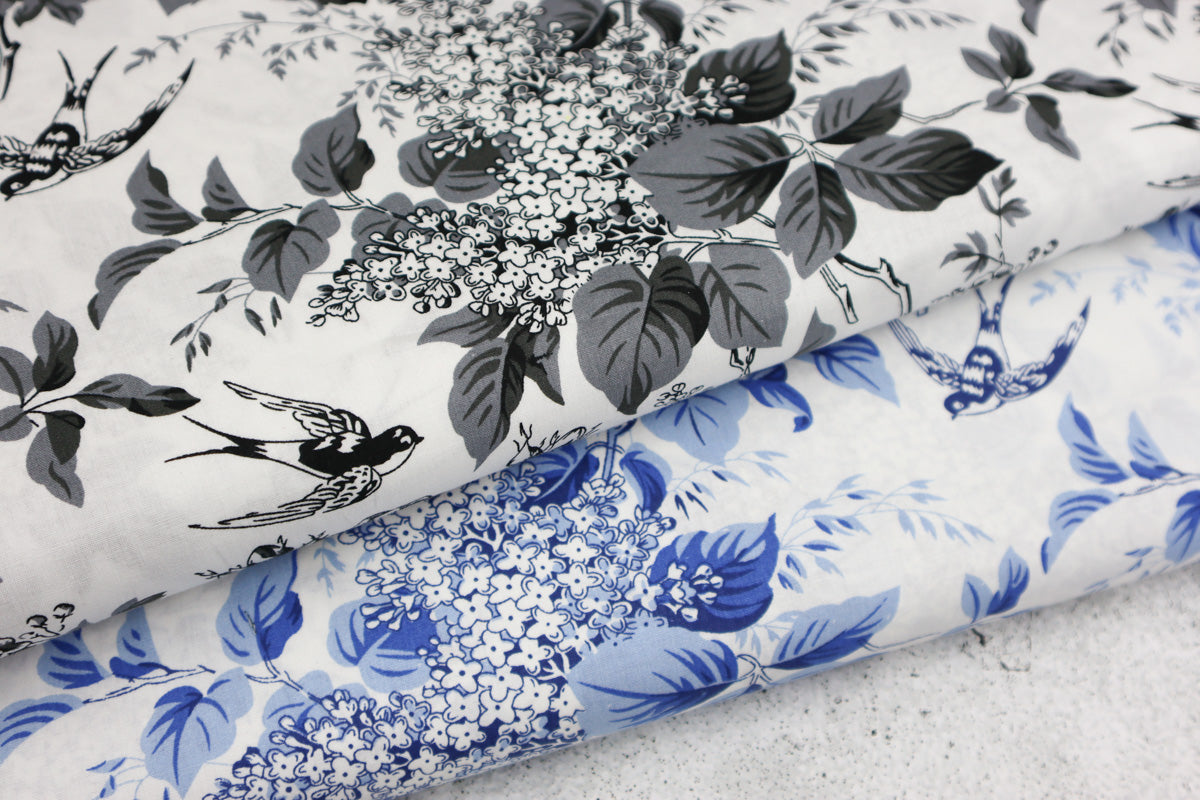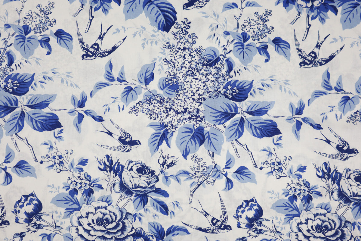 Tolles Muster mit blauen oder schwarzen Blüten und Schwalben auf weißem Hintergrund.