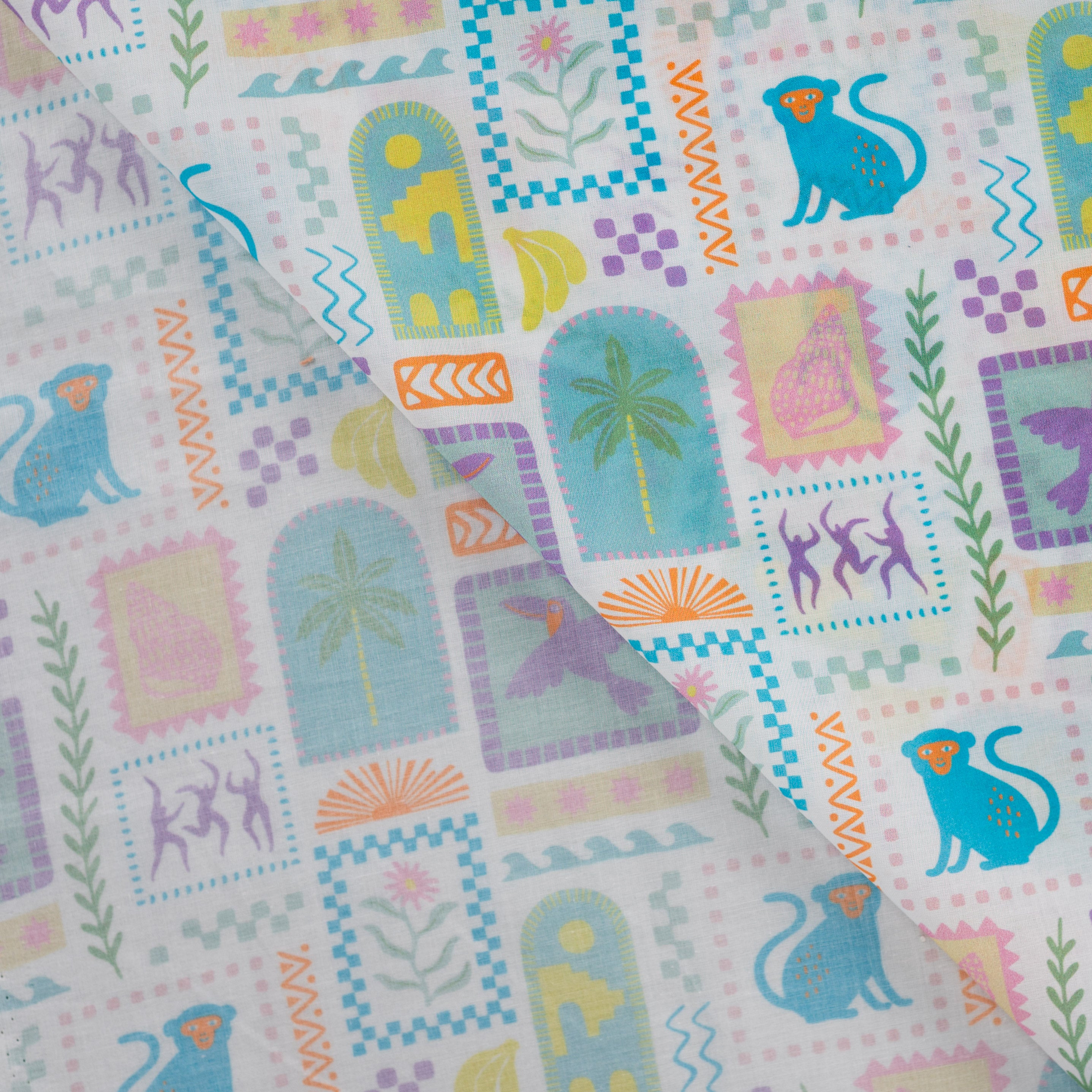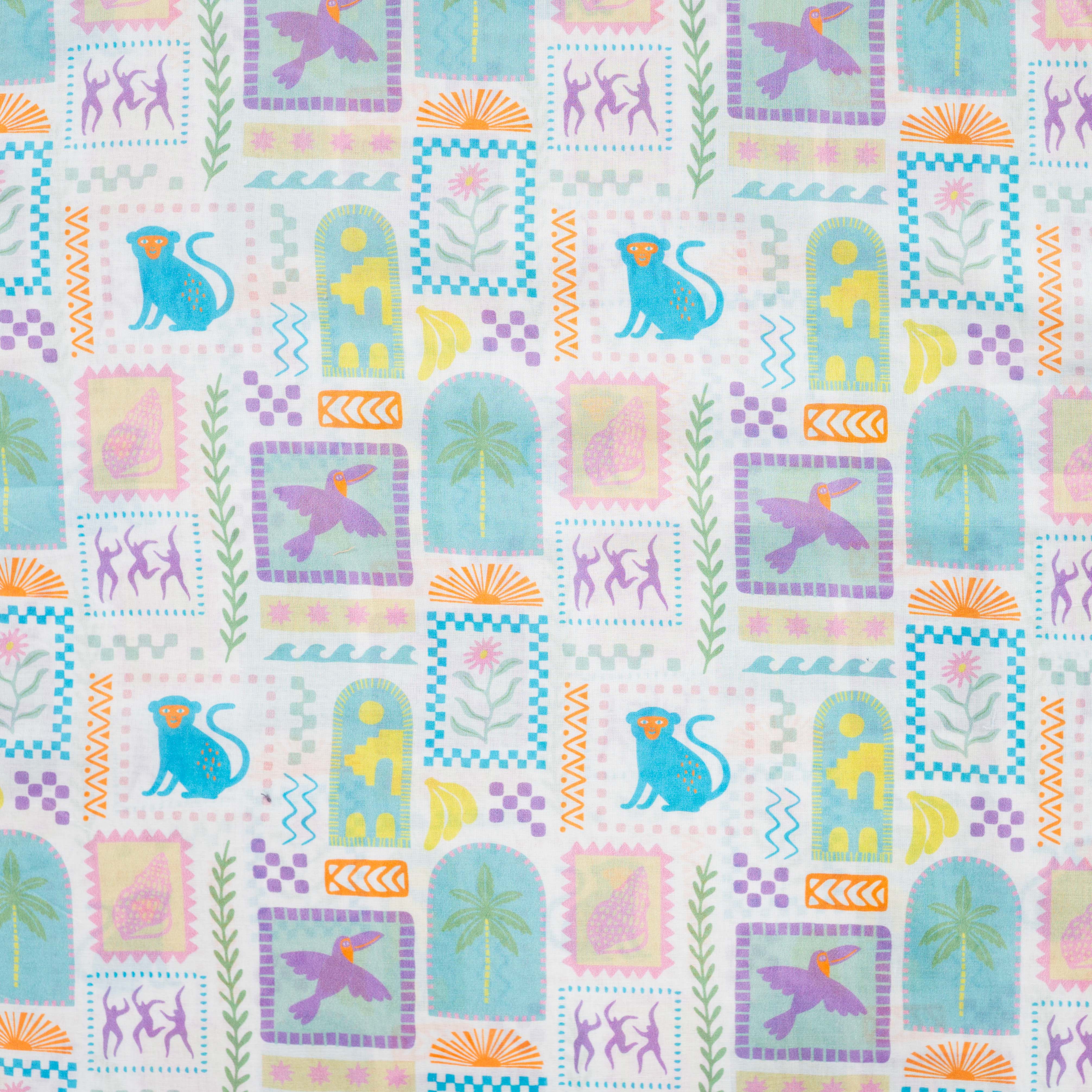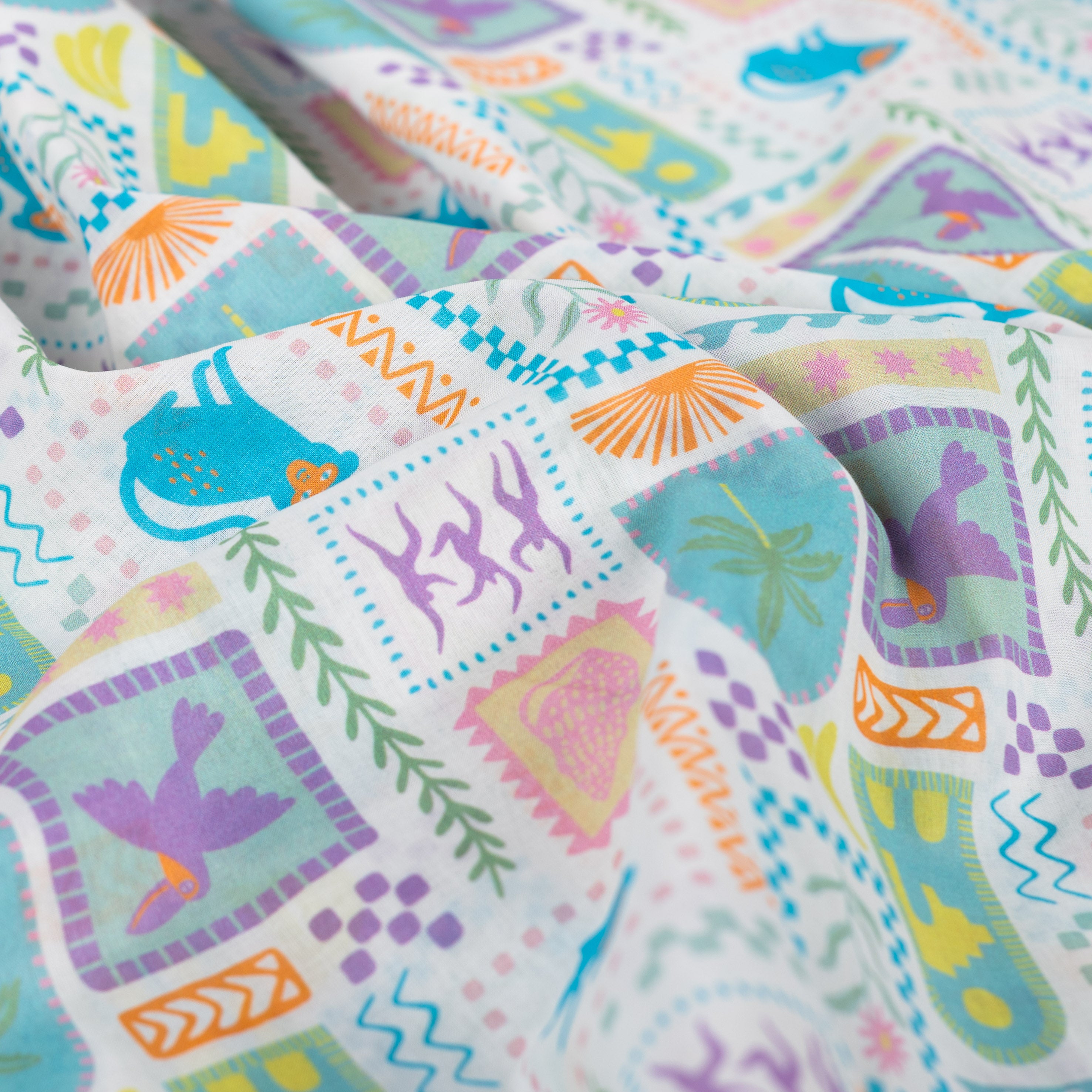 Leichter Baumwoll Voile mit buntem, tropischem Muster.