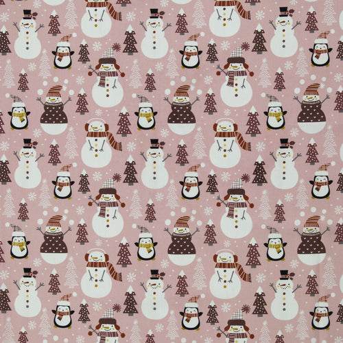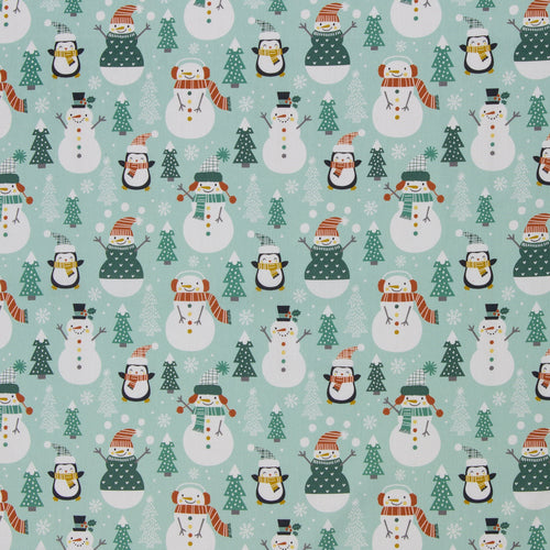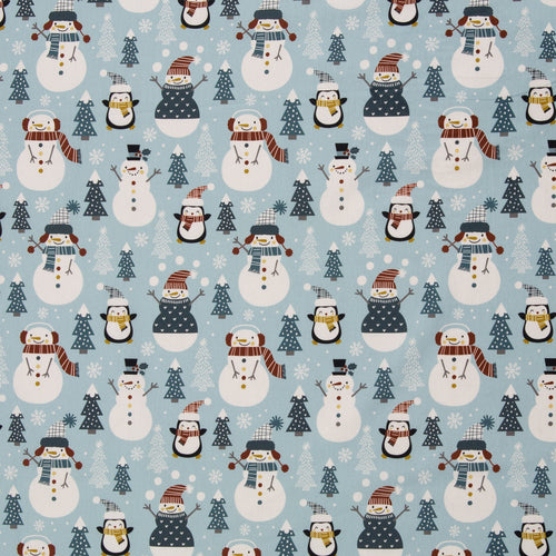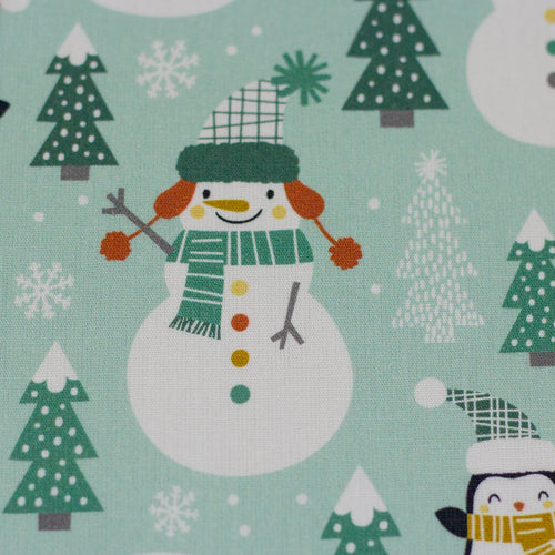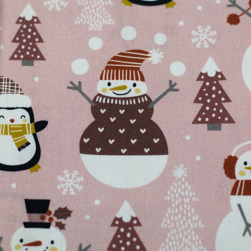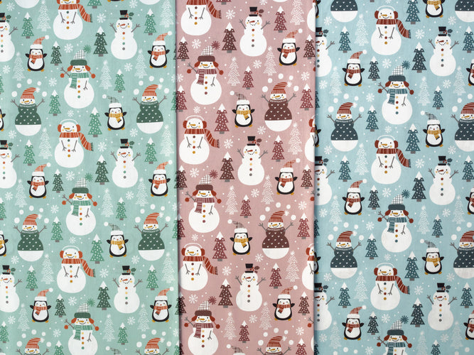 Super niedliches Kindermuster mit kleinen Pinguinen und Schneemännern in winterlicher Umgebung.