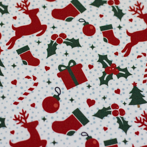Tolles Muster mit kleinen Rentieren und weihnachtlichen Accessoires.