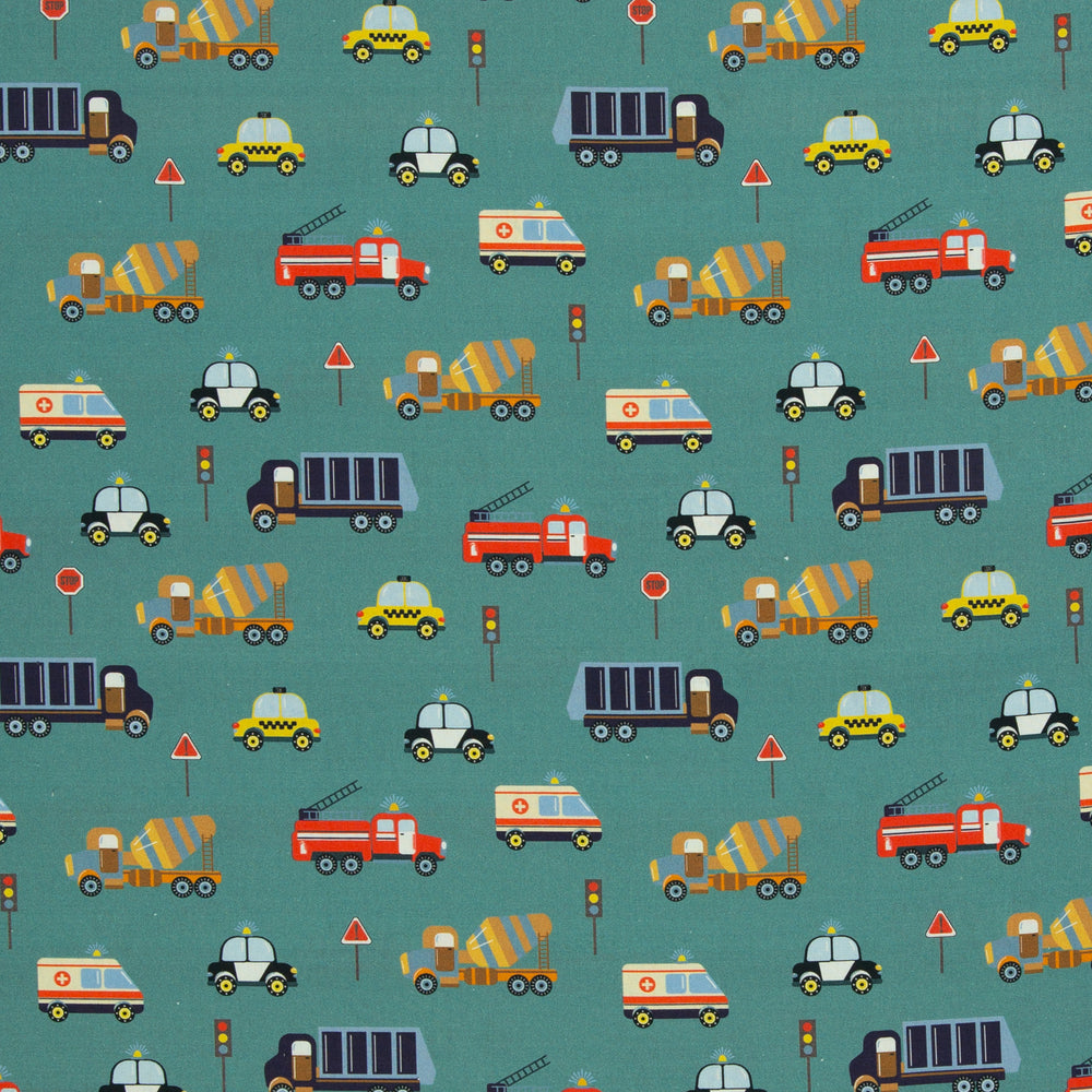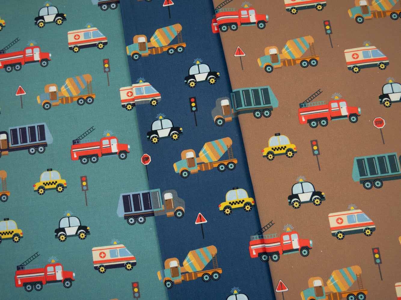 Bill ist besonders vielseitig: Neben dem Baustein-Design gibt es die Baumwollwebware auch mit coolen Fahrzeugen – von Feuerwehr, Polizei und Krankenwagen bis hin zu Betonmischern und Lastwagen.
