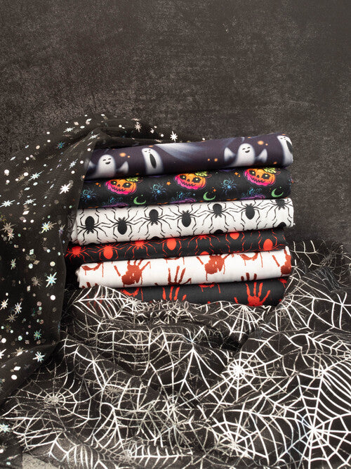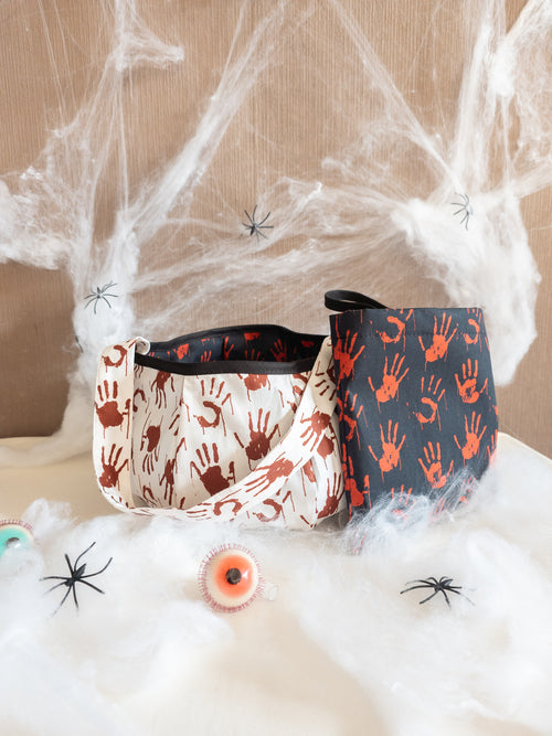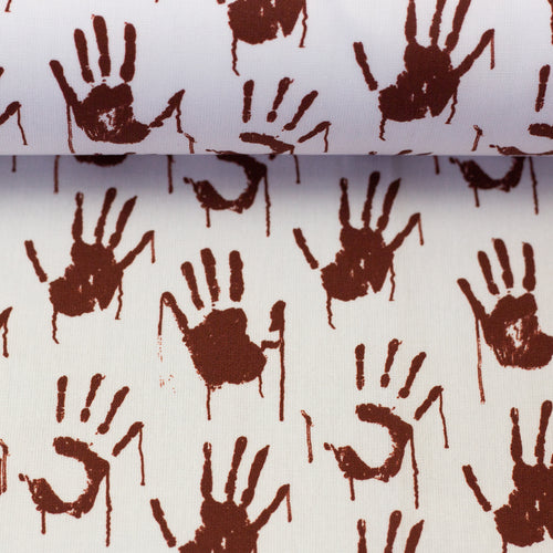 Auf Webware Booo! gibt es die roten Handabdrücke auf schwarzem und weißem Grund sowie rote Spinnen auf Schwarz und schwarze Spinnen auf Weiß. Diese lassen sich so gut miteinander kombinieren – für coole Wendebeutel, Kissen und mehr!