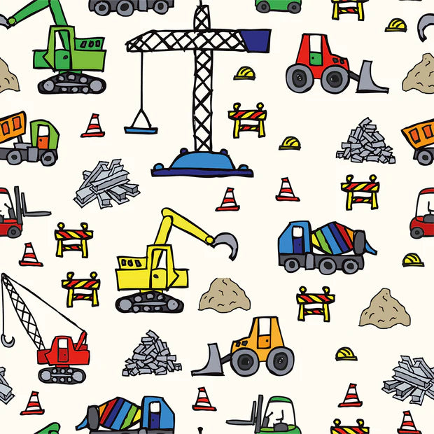 Schönes Muster, digital bedruckt, mit verschiedenen Baustellen Fahrzeuigen und Utensilien.