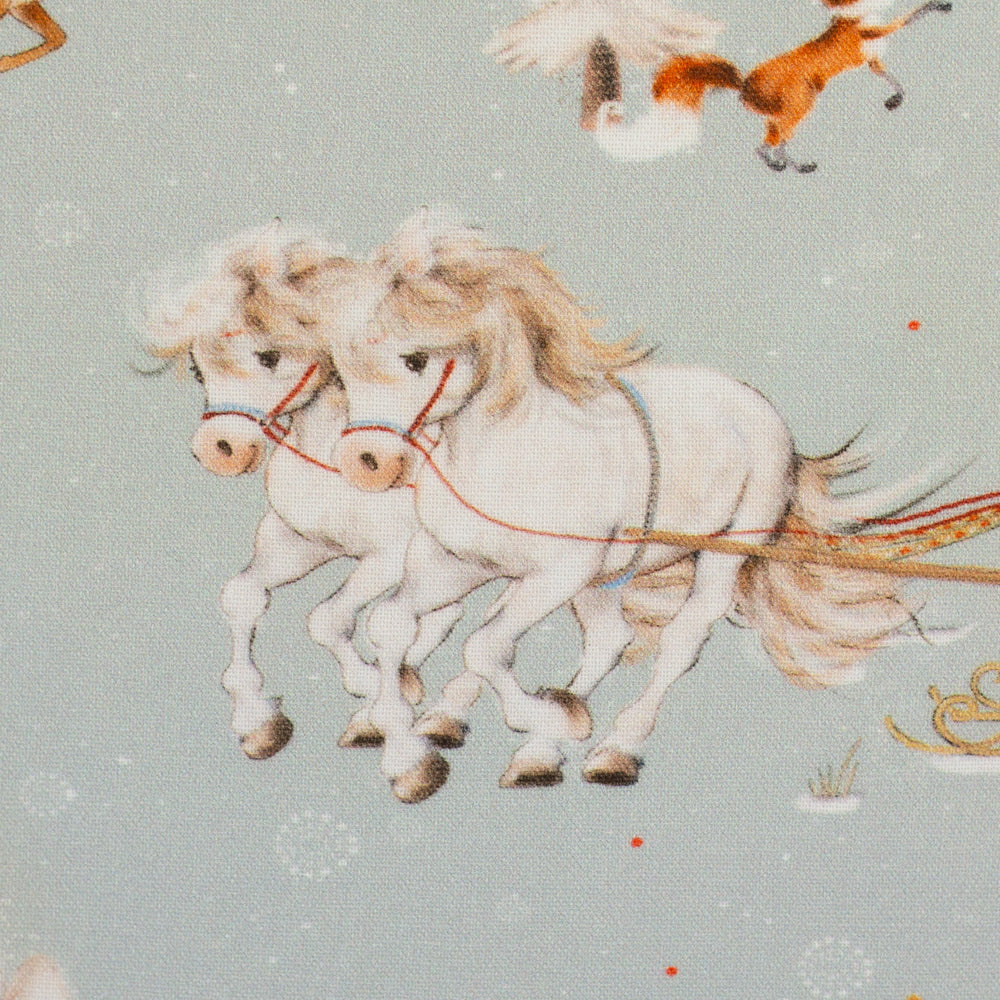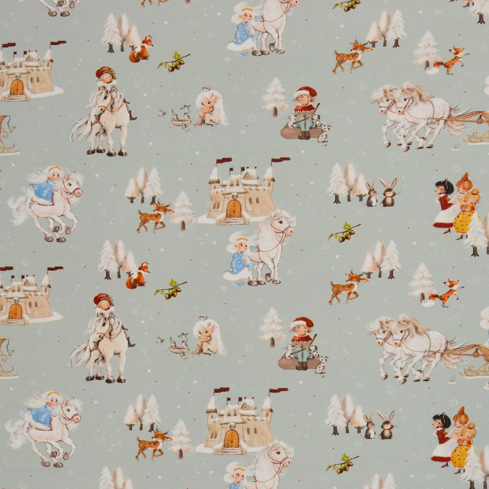 Aschenputtel (Cinderella) schließlich vereint alles, was wir aus dem Märchen kennen: das Schloss, den Prinzen, das blaue Kleid, die drei Haselnüsse und die Tiere des Waldes. Erhältlich auf hellem Beige und zartem Mint wirkt das Motiv winterlich-märchenhaft und zugleich zeitlos.