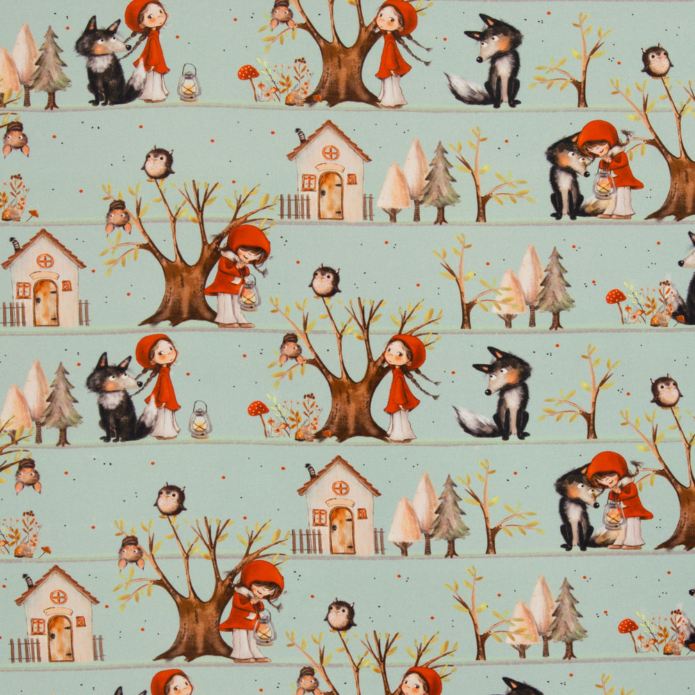 Rotkäppchen bezaubert auf Naturweiß und hellem Türkis mit Großmutters Häuschen, dem Wolf, niedlichen Waldbewohnern und kleinen, verspielten Details – ein fröhliches Design, das das Märchen von einer sanften Seite zeigt.