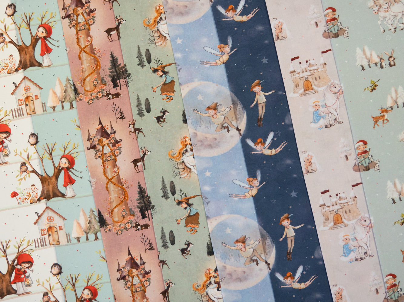 Mit Fairy Tale wird es märchenhaft – vier zauberhafte Motive laden dazu ein, in die Welt der Geschichten einzutauchen. Die Illustrationen sind detailreich und liebevoll gestaltet und bringen bekannte Märchenfiguren in zarten Farben und traumhaften Szenen auf hochwertige Baumwollwebware.