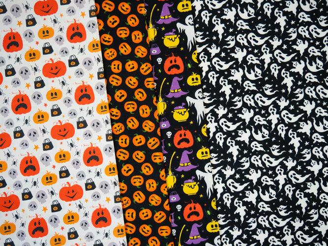 Halloweenstoffe sind auch im Stoffhandel ein wichtiges Thema geworden, das immer präsenter wird. (Nicht nur) Kinder haben Spass am Gruseln und Verkleiden und am gruselig-schönen Dekorieren mit Kürbislaternen. “Süßes, sonst gibt’s Saures”: Wenn die kleinen Geister klingeln, gibt man doch gerne eine Süßigkeit mit! Die Halloween-Baumwollserie umfasst vier Designs: Das größere Design mit dem Geisterhaus und Kürbissen, dem Geist und dem Besen, die passenden Geister und Sterne auf schwarzem Grund, klassische Halloweenkürbisse auf Schwarz und die Kürbisse, Totenköpfe und Spinnen auf Weiß.