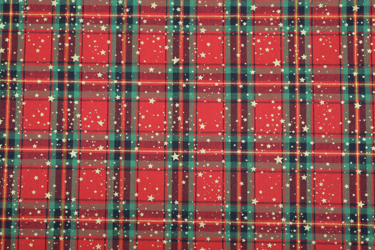 Toller Baumwollstoff mit klassischem Weihnachtsmotiv: Goldene schimmernde Sterne auf rotem Karomuster.