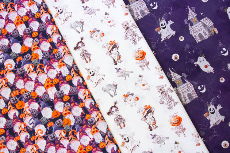 Halloween naht und wir haben die passenden Stoffe! Dabei sind die süßen Designs auf Webware Henry kindgerecht und nicht zuuu gruselig! Wir haben ein Geisterschloss und liebe Gespenster auf lila Grund, einen weißen Stoff mit Geistern, der kleinen Hexe, der Mumie, einem gruseligen Mädchen, der Katze, dem Raben und einem Halloweenkürbis. Außerdem gibt es ein cooles Design mit Halloween-Zwergen und Kürbissen auf lila Untergrund – so witzig die mit Kürbissen und Fledermäusen gemusterten Mützen der Zwerge!