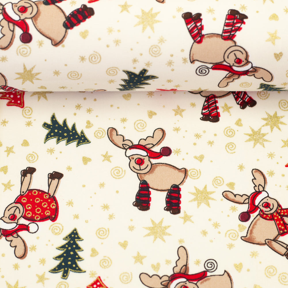Eine ganz besonders festliche Webware mit goldenem Schimmer: Mit Rudolf zieht weihnachtliche Stimmung ins Nähzimmer ein! Die Baumwoll-Webware begeistert mit drei stimmungsvollen Grundfarben, strahlendem Rot, klassischem Dunkelgrün und edlem Naturweiß.