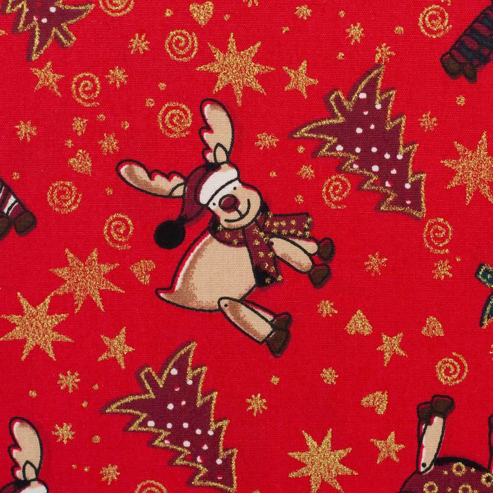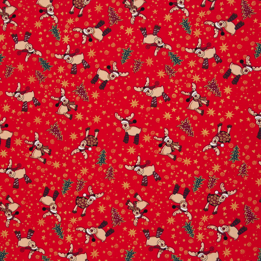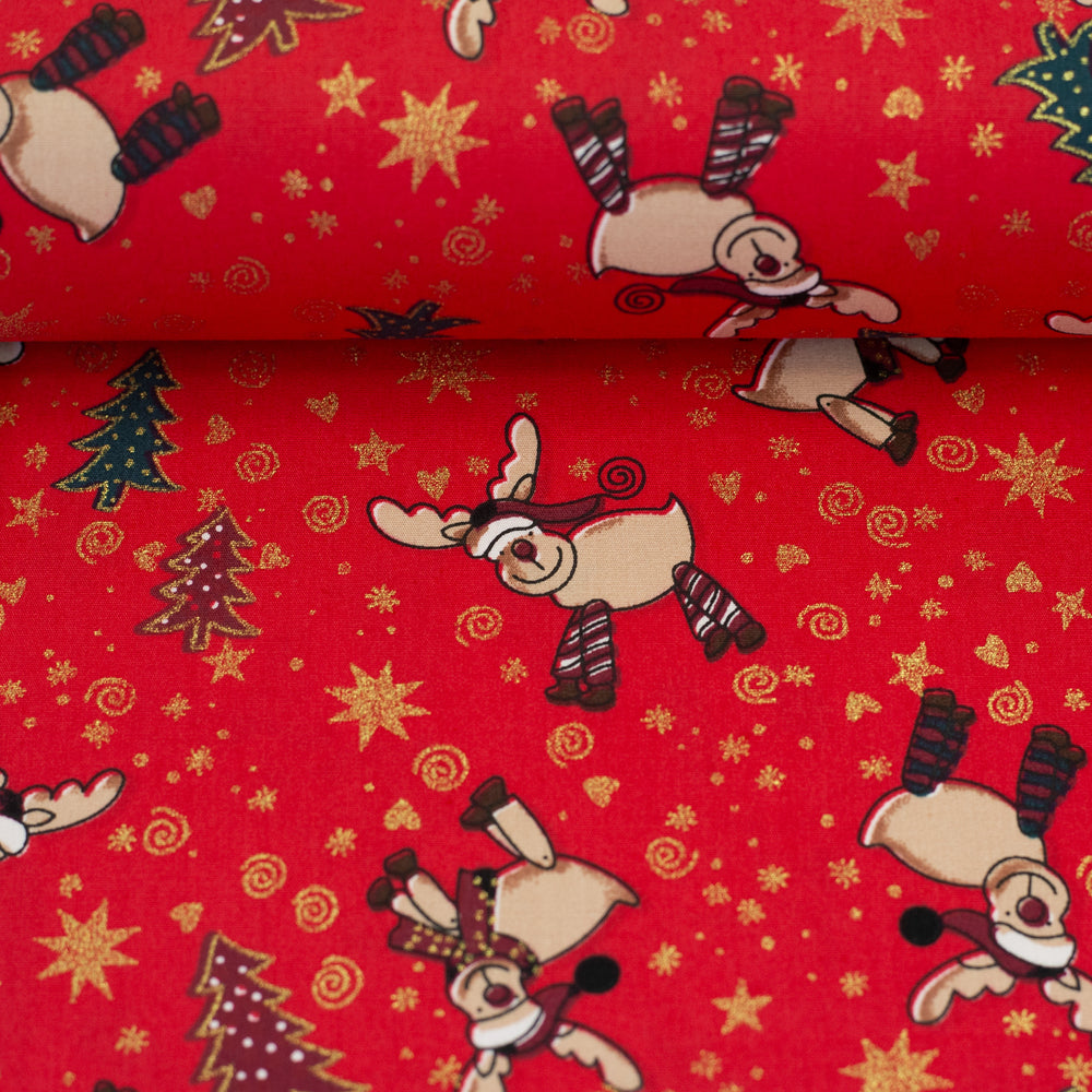 Eine ganz besonders festliche Webware mit goldenem Schimmer: Mit Rudolf zieht weihnachtliche Stimmung ins Nähzimmer ein! Die Baumwoll-Webware begeistert mit drei stimmungsvollen Grundfarben, strahlendem Rot, klassischem Dunkelgrün und edlem Naturweiß.