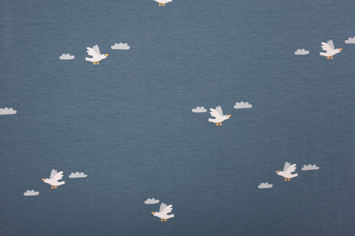 Tolles Muster mit kleinen Vögeln und Wolken auf indigoblauem Hintergrund.