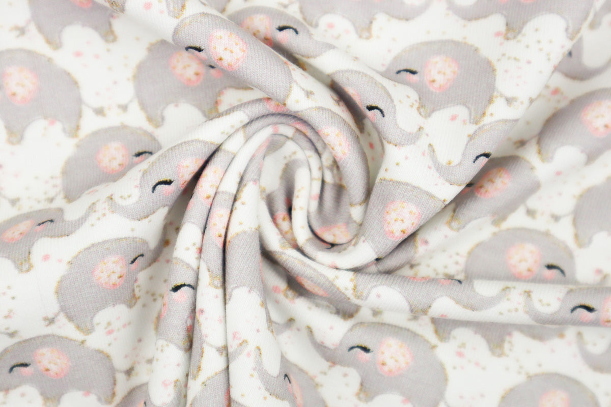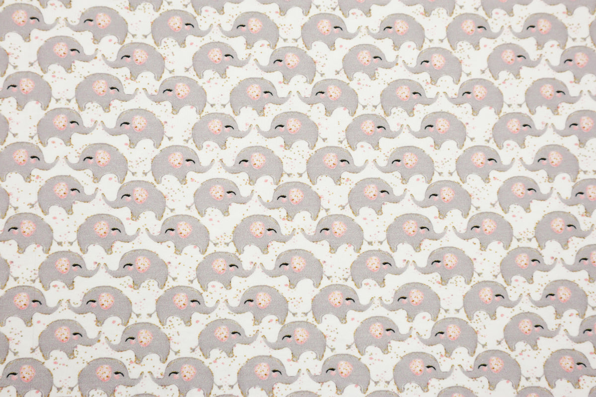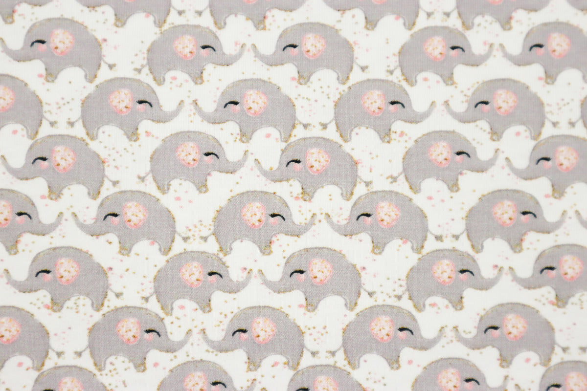 Schöner Baumwolljersey mit kleinen Elefanten auf wollweißem Hintergrund.