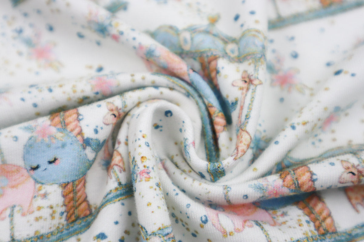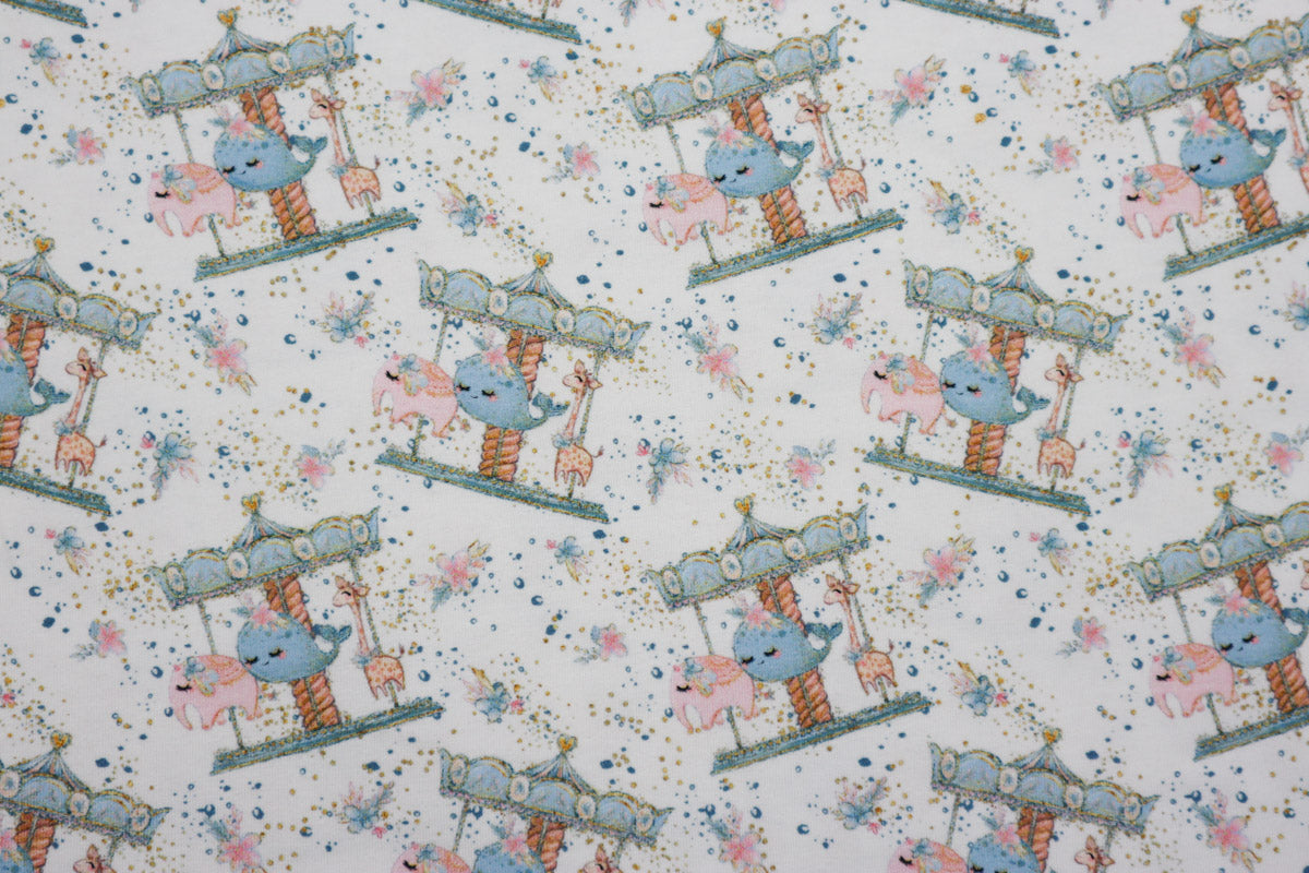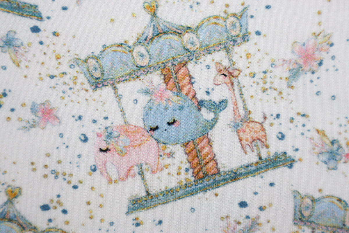 Schöner Baumwolljersey mit liebevoll gestaltetem Tier Karussell auf wollweißem Hintergrund.