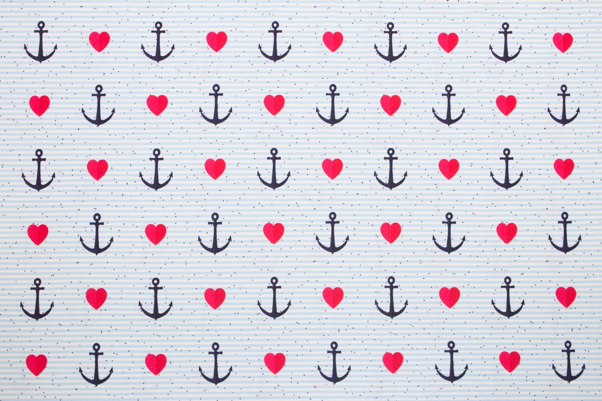 Wunderschönes, maritimes Muster mit kleinen Ankern, roten Herzchen und mini Punkten auf gestreiftem Hintergrund.