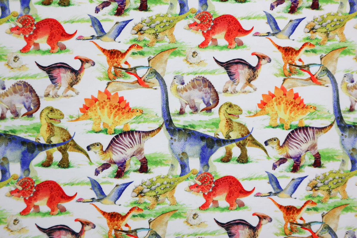 Tolles Muster mit unterschiedlichen Dinos in bunten Farben auf naturweißem Hintergrund.