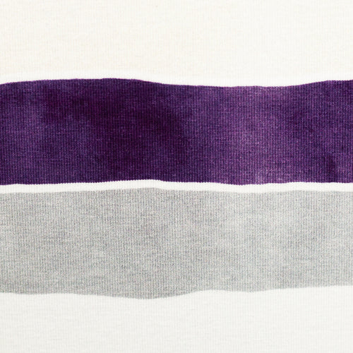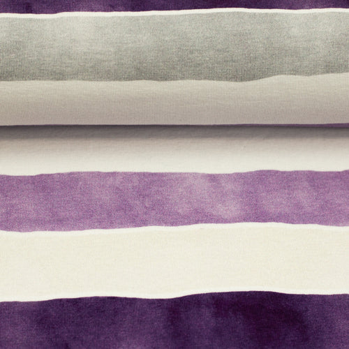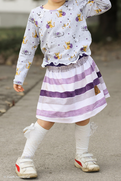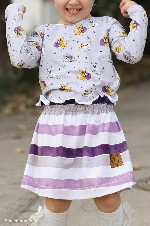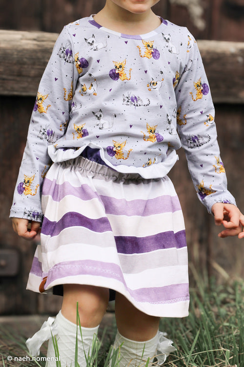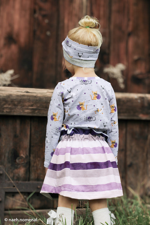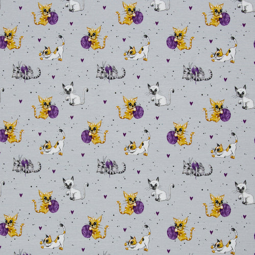 Auf dem grauen Jersey mit Akzenten in lila sieht man niedliche Kätzchen, von denen einige vergnügt mit einem Wollknäuel spielen. So süß – mit Sprenkeln und kleinen Herzchen! Dazu gibt es den passenden, unregelmäßigen Aquarellstreifen in Grau-Weiß-Lila.