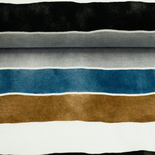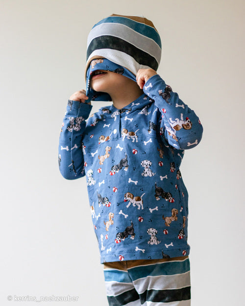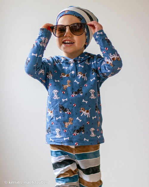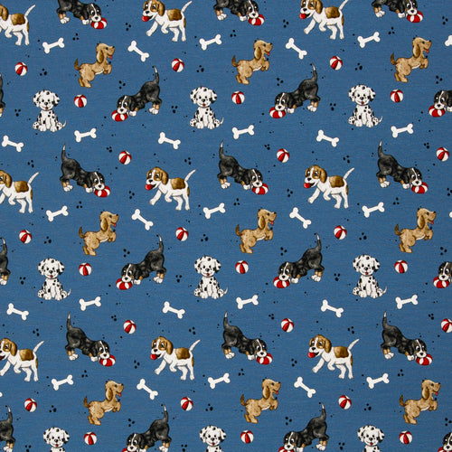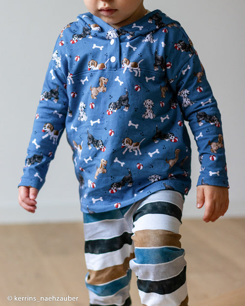 Auf dem Dogs-Jersey sieht man süße, kleine Hunde, die springen, sitzen oder mit dem rot-weißen Bällchen spielen auf einem jeansblauen Hintergrund mit Sprenkeln. Auch zu den Hunden gibt es den passenden Aquarellstreifen – ideal als Kombistoff, aber auch für sich alleine sehr schön.