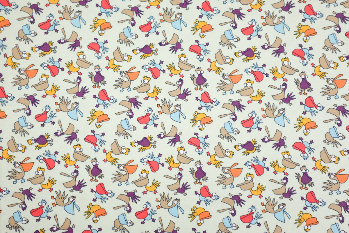 Gute-Laune Baumwolljersey für Kinder mit bunten Pelikanen auf blass-mintfarbenem Grund.