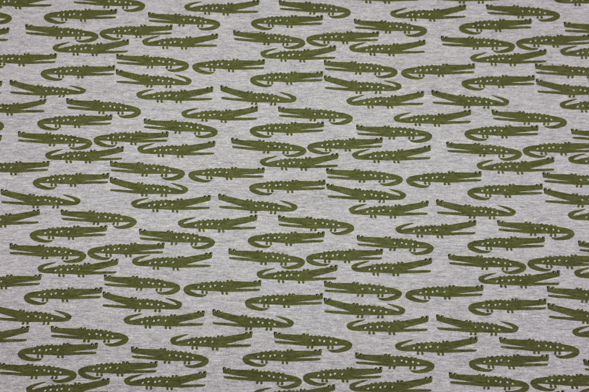Cooler Baumwolljersey mit grünen Krokodilen auf grau meliertem Grund.