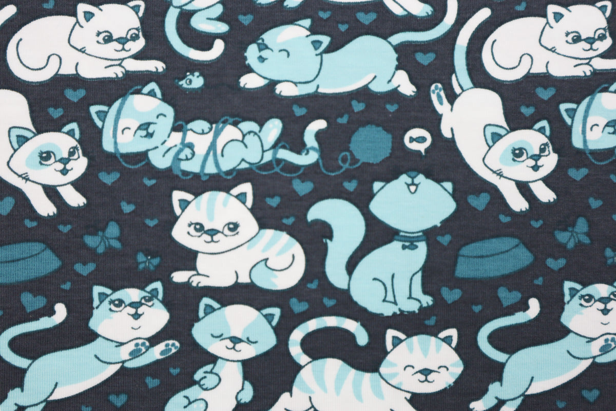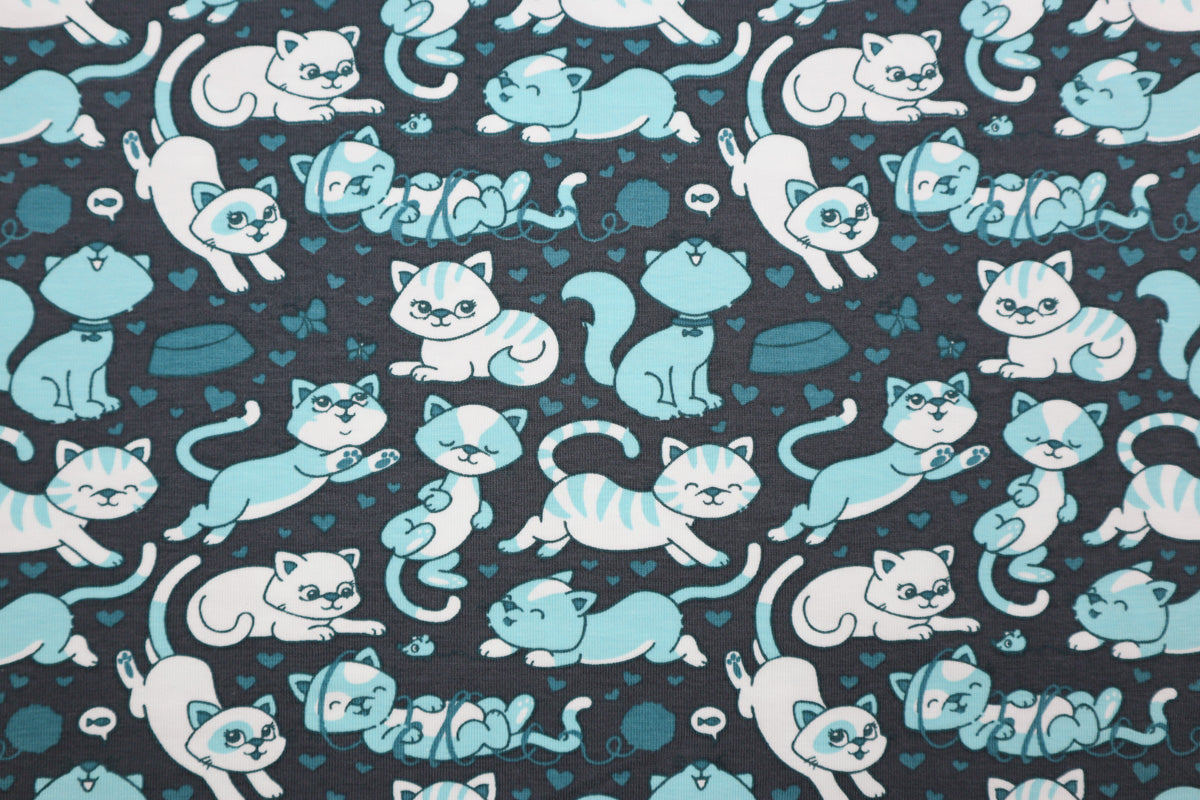 Schönes Muster mit spielenden Katzen in mint auf dunkelgrauem Hintergrund.