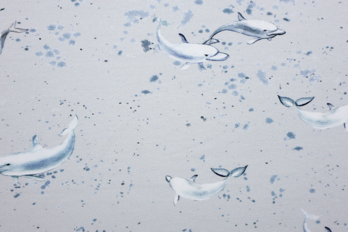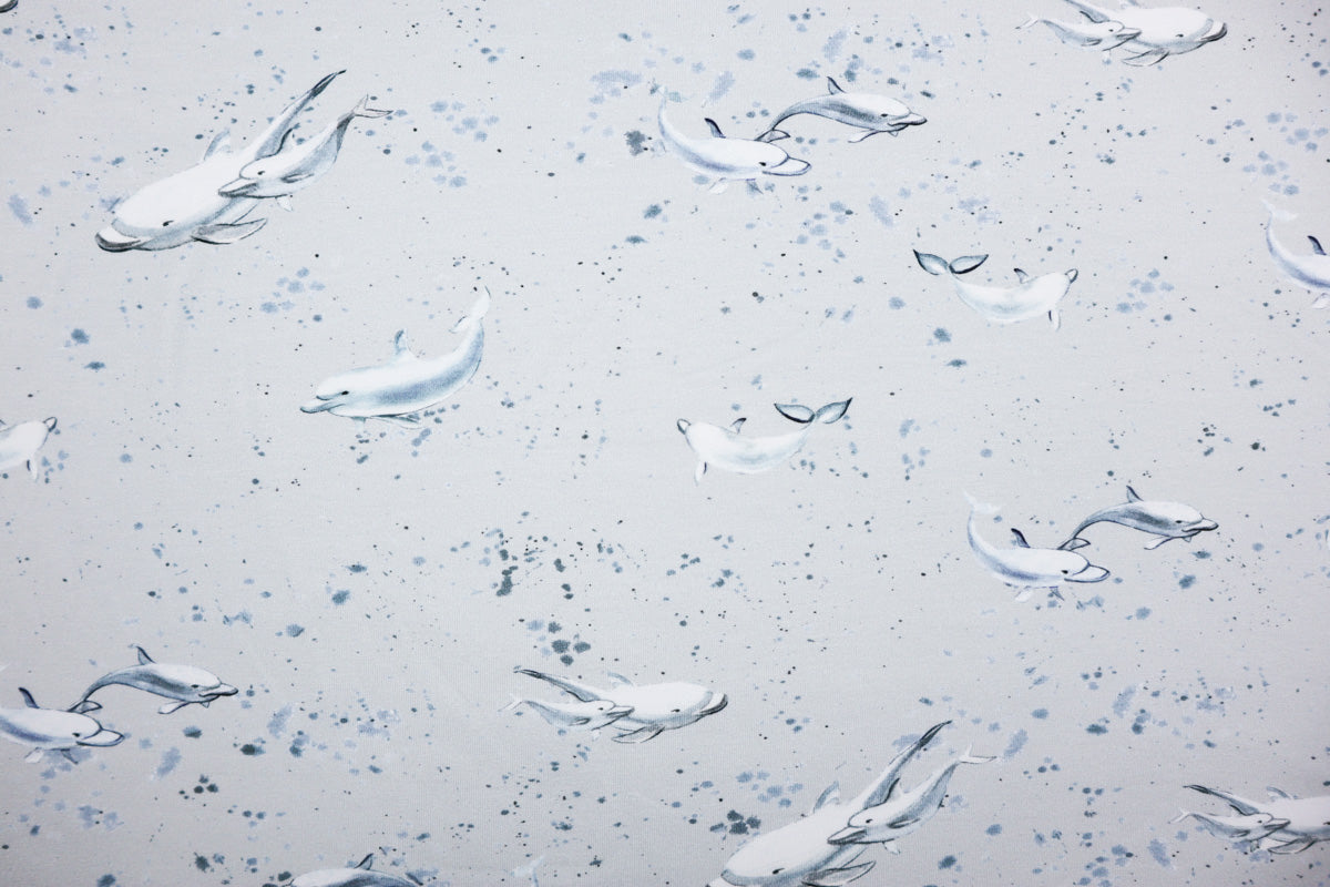 Schönes Muster mit Delfinen auf hellgrauem Hintergrund.