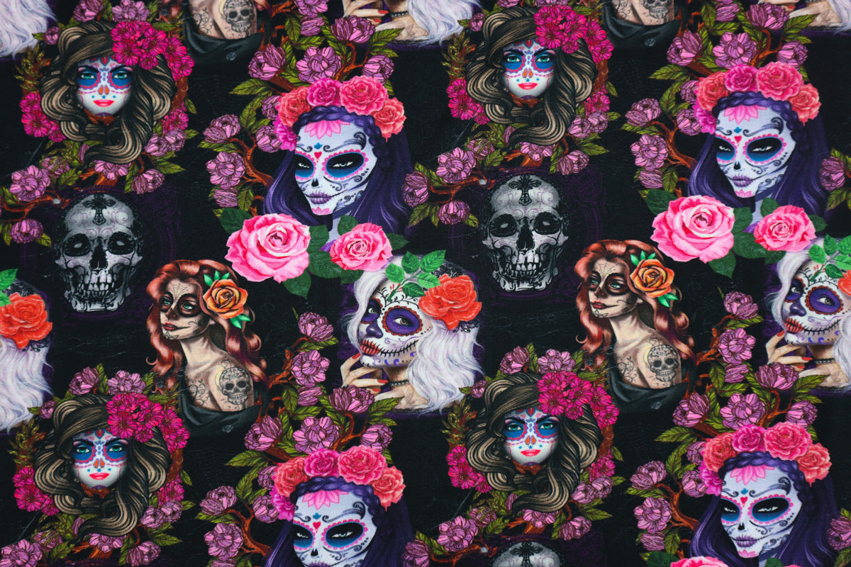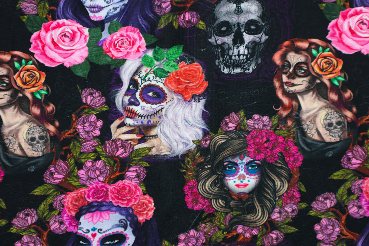 Richtig cooler Halloween Jersey mit "Día de Muertos" Motiven, Totenköpfen und Blumen. Genau das Richtige für deine Grusel-Party.