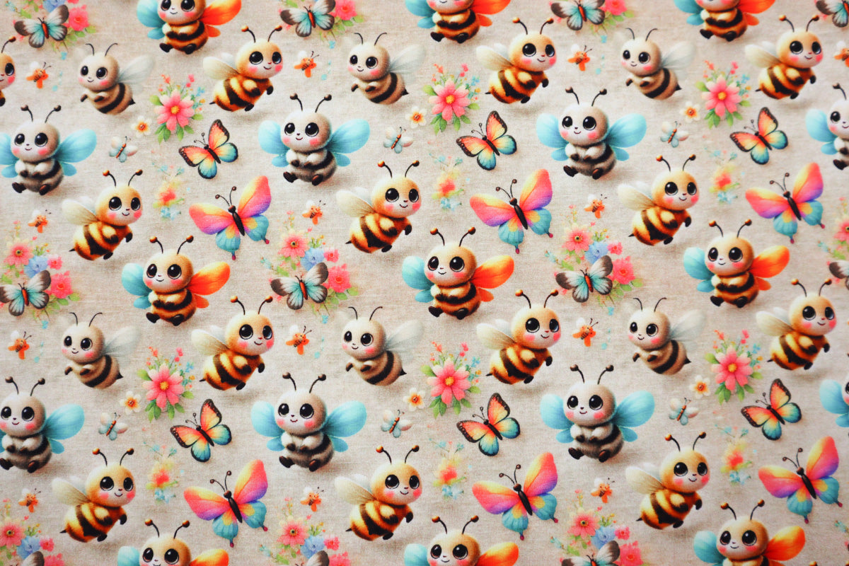 Niedliches Muster mit kleinen Bienen und bunten Schmetterlingen.