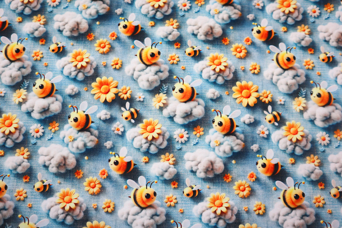 Niedliches Muster mit kleinen Bienen und gelben Blüten auf blauem Hintergrund in Jeans-Optik.