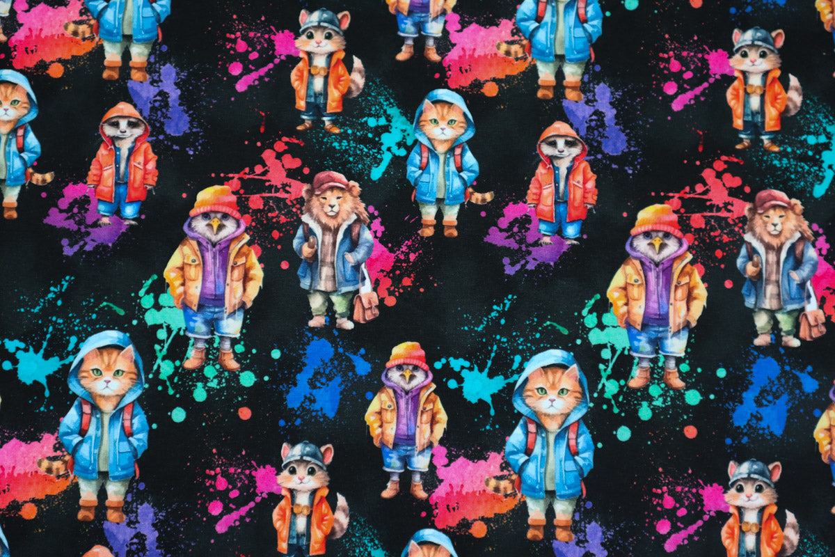 Kleine Mäuse, Füchse, Hunde & Co in angesagten Klamotten mit bunten Farbklecksen in Hintergrund.